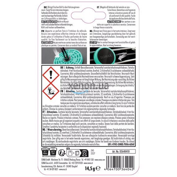 Ароматизатор Sonax Ocean Fresh — это идеальное решение для тех, кто ценит свежесть и чистоту в салоне автомобиля. Ароматизатор с освежающим морским ароматом создает ощущение прохлады и чистоты, как будто вы находитесь на берегу океана.
