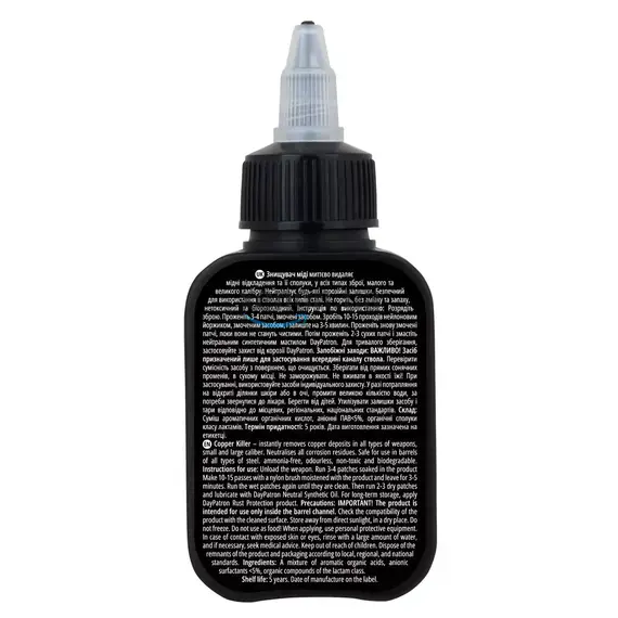Удалитель меди 100 мл DAY PATRON Copper Killer - мгновенно вступает в реакцию и удаляет отложение меди и ее соединения после выстрела, во всех типах оружия, малого и большого калибра. Эффективно нейтрализует любые коррозионные остатки, краткосрочно предотвращая появление ржавчины и коррозии. Безопасный для использования в стволах из нержавеющей стали и других типов. Не вступает в реакцию с металлами из которых изготовлено оружие. Уникальная негорящая формула, без аммиака и запаха, нетоксичная и биоразлагаемая.