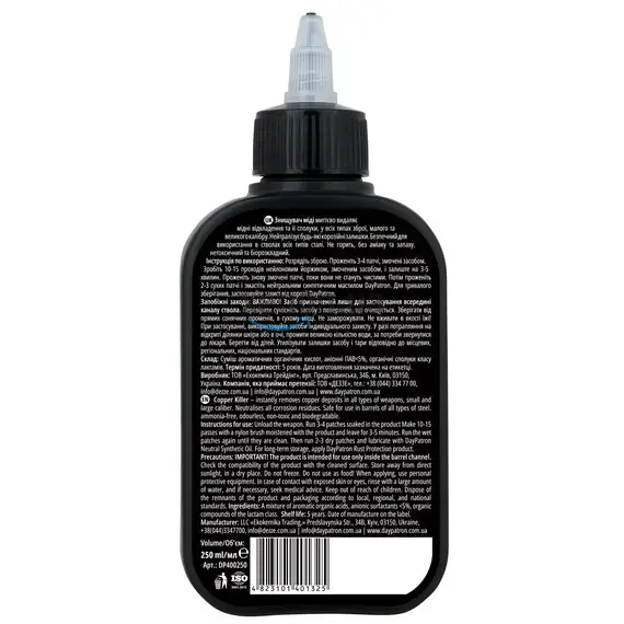Удалитель меди 250 мл DAY PATRON Copper Killer - мгновенно вступает в реакцию и удаляет отложение меди и ее соединения после выстрела, во всех типах оружия, малого и большого калибра. Эффективно нейтрализует любые коррозионные остатки, краткосрочно предотвращая появление ржавчины и коррозии. Безопасный для использования в стволах из нержавеющей стали и других типов. Не вступает в реакцию с металлами из которых изготовлено оружие. Уникальная негорящая формула, без аммиака и запаха, нетоксичная и биоразлагаемая.