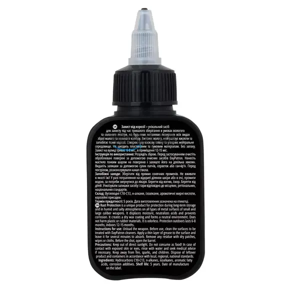 Консервационная масло (защита от коррозии) 100 мл DAY PATRON Rust Protection Oil - уникальное средство, предназначенное для защиты при длительном хранении в неблагоприятных условиях, и применения в условиях влажного и соленого воздуха, на металлических поверхностях всех видах нарезного и гладкоствольного оружия малого и большого калибра.