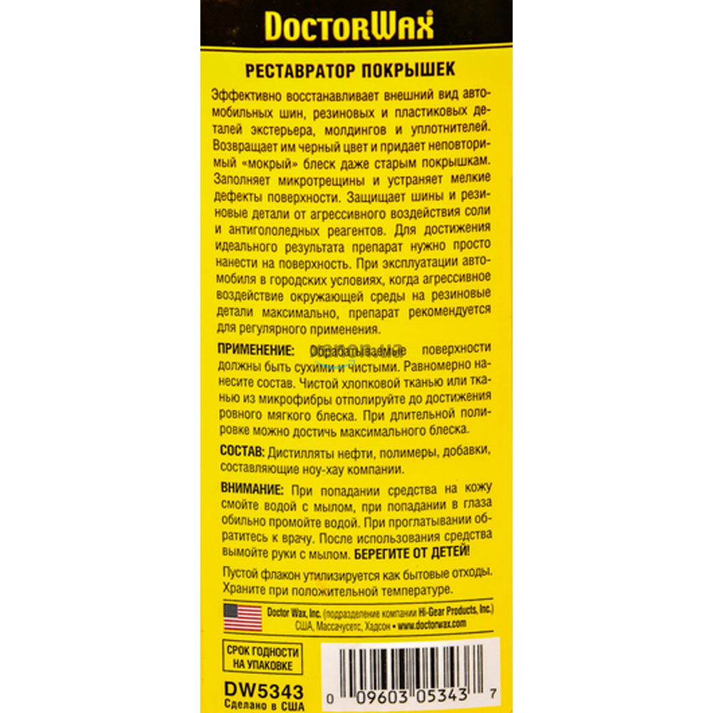 Мнение эксперта о реставраторе покрышек Doctor Wax: "Восстанавливает черный цвет резины и придает ей блеск, при чем, на достаточно долгое время. Воспрепятствует появлению трещин в покрышке и также полезен для уплотнителей двери, которые им также можно обрабатывать."