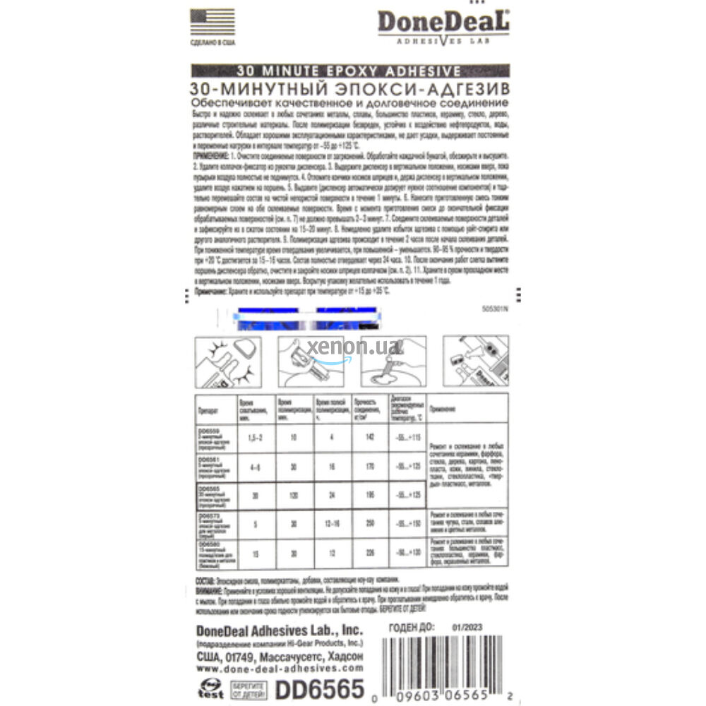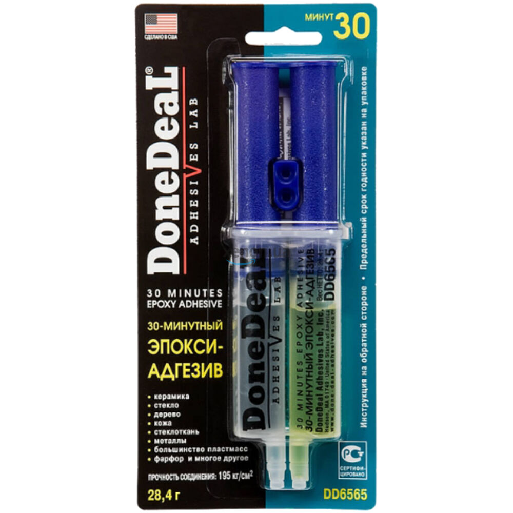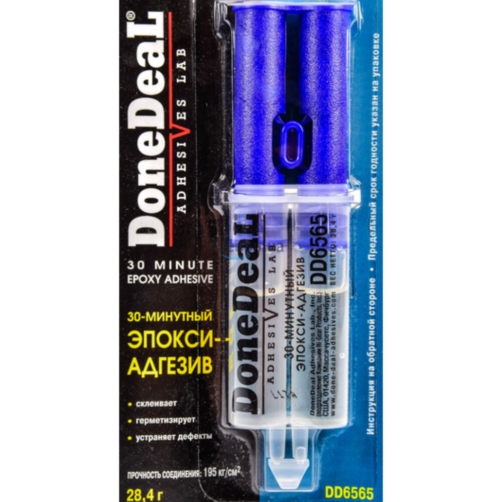 30-минутный эпокси-адгезив (цвет: прозрачный) (28,4 г) Done Deal DD6565. Двухкомпонентный эпокси-адгезив в упаковке "шприц" для ремонта и склеивания различных материалов. Образует надежное и долговечное водонепроницаемое соединение. Двухкомпонентный состав в упаковке "шприц" обеспечивает долгое и надежное соединение различных материалов в любых сочетаниях.