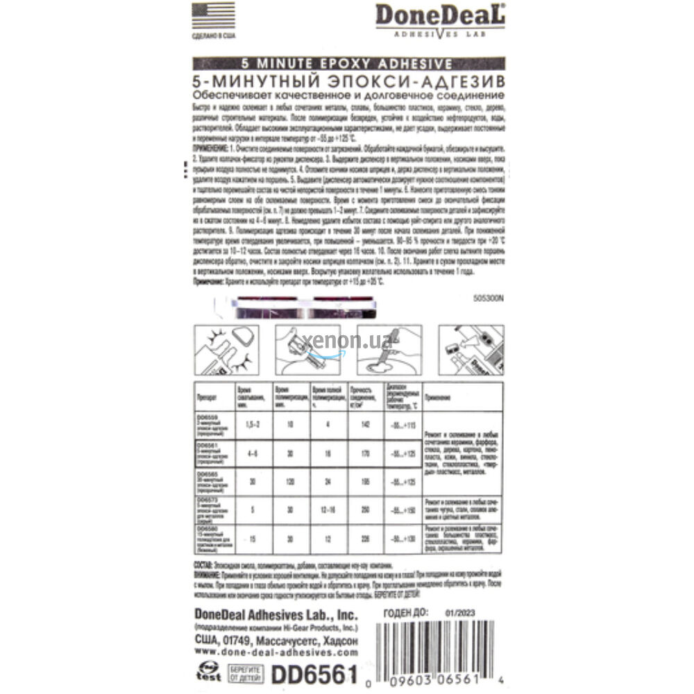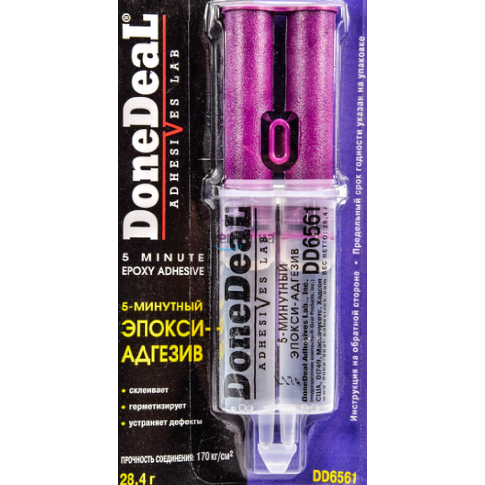 Прозрачный 5-минутный эпокси-адгезив (цвет: прозрачный) (28,4 г) Done Deal DD6561. Двухкомпонентный эпокси-адгезив в упаковке "шприц" для ремонта и склеивания различных материалов. Образует надежное и долговечное водонепроницаемое соединение. Двухкомпонентный состав в упаковке "шприц" обеспечивает долгое и надежное соединение различных материалов в любых сочетаниях.