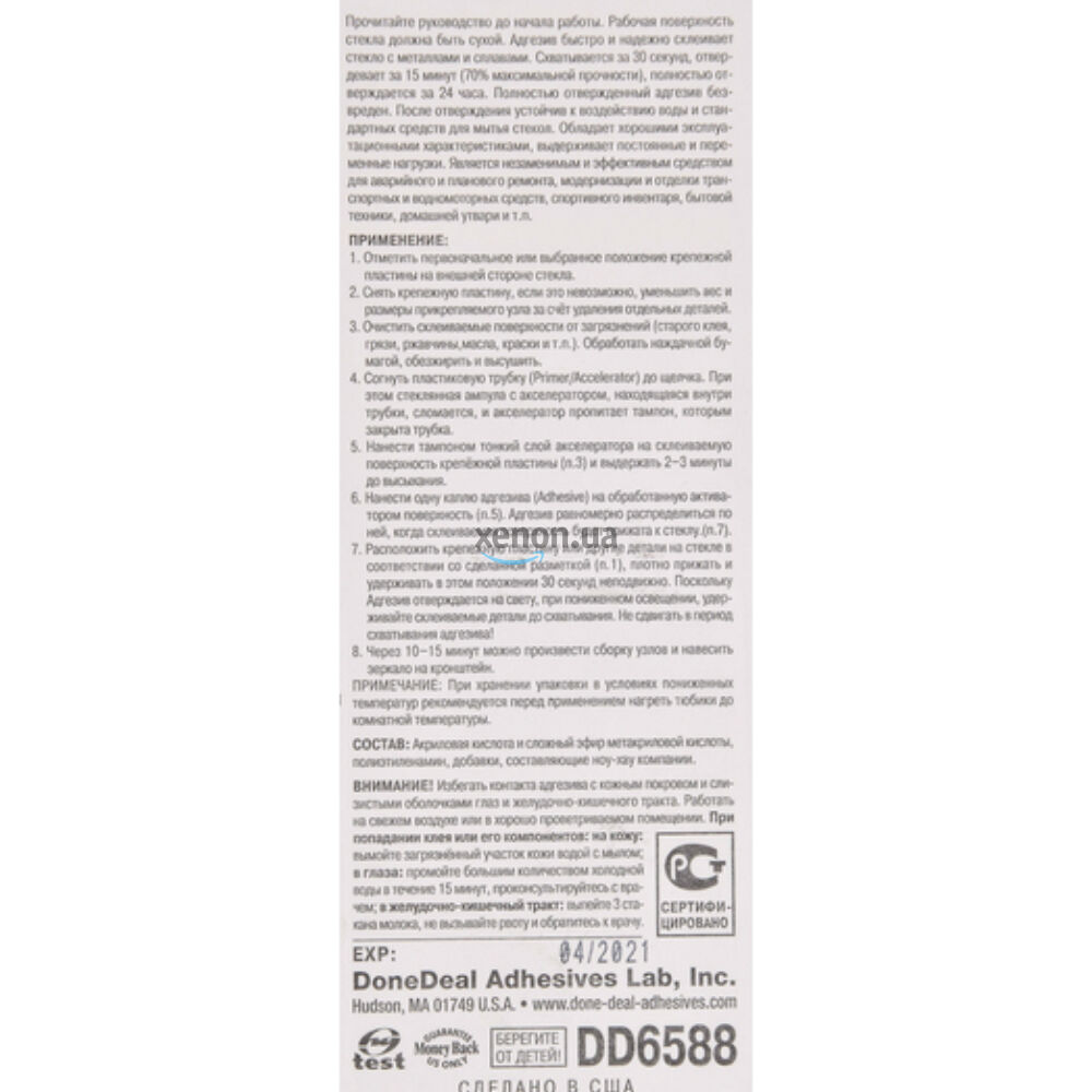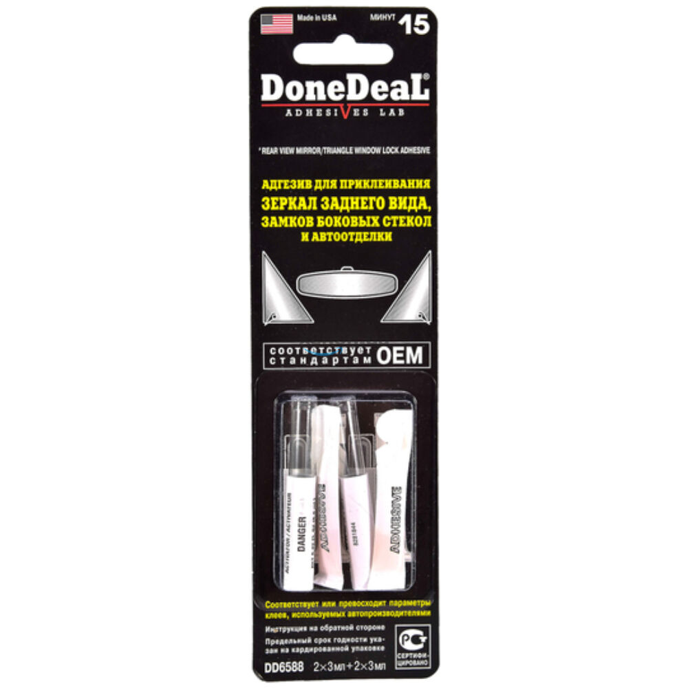 Адгезив для приклеивания зеркал заднего вида и автоотделки двойная упаковка (4x3 мл) Done Deal DD6588. Незаменимое и эффективное средство для аварийного и планового ремонта, модернизации и отделки транспортных и водно-моторных средств, спортивного инвентаря, бытовой техники, домашней утвари и т.д. Быстро и надежно склеивает стекло с металлами и сплавами. Адгезив для приклеивания зеркал заднего вида, замков боковых стекол и автоотделки. Соответствует или превосходит параметры клеев, используемых автопроизводителями.