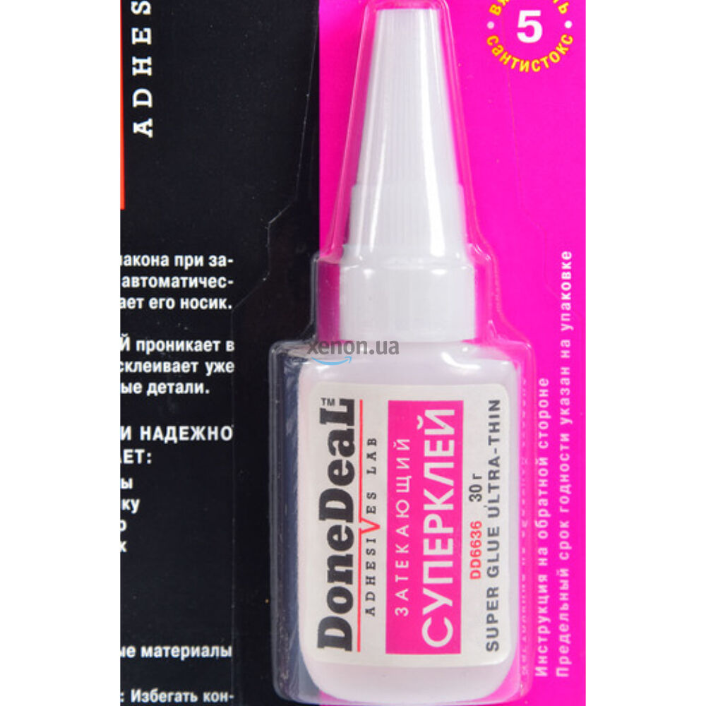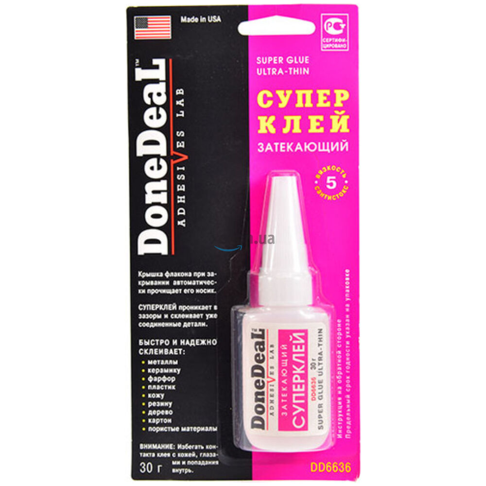 Супер клей затекающий (30 г) Done Deal DD6636. Суперклей затекающий для склеивания различных материалов, обладающий высочайшей текучестью, смачиваемостью и адгезией. Суперклей проникает в зазоры и склеивает уже соединенные детали. Универсальный цианакрилатный клей (суперклей) для быстрого и надежного склеивания различных материалов.