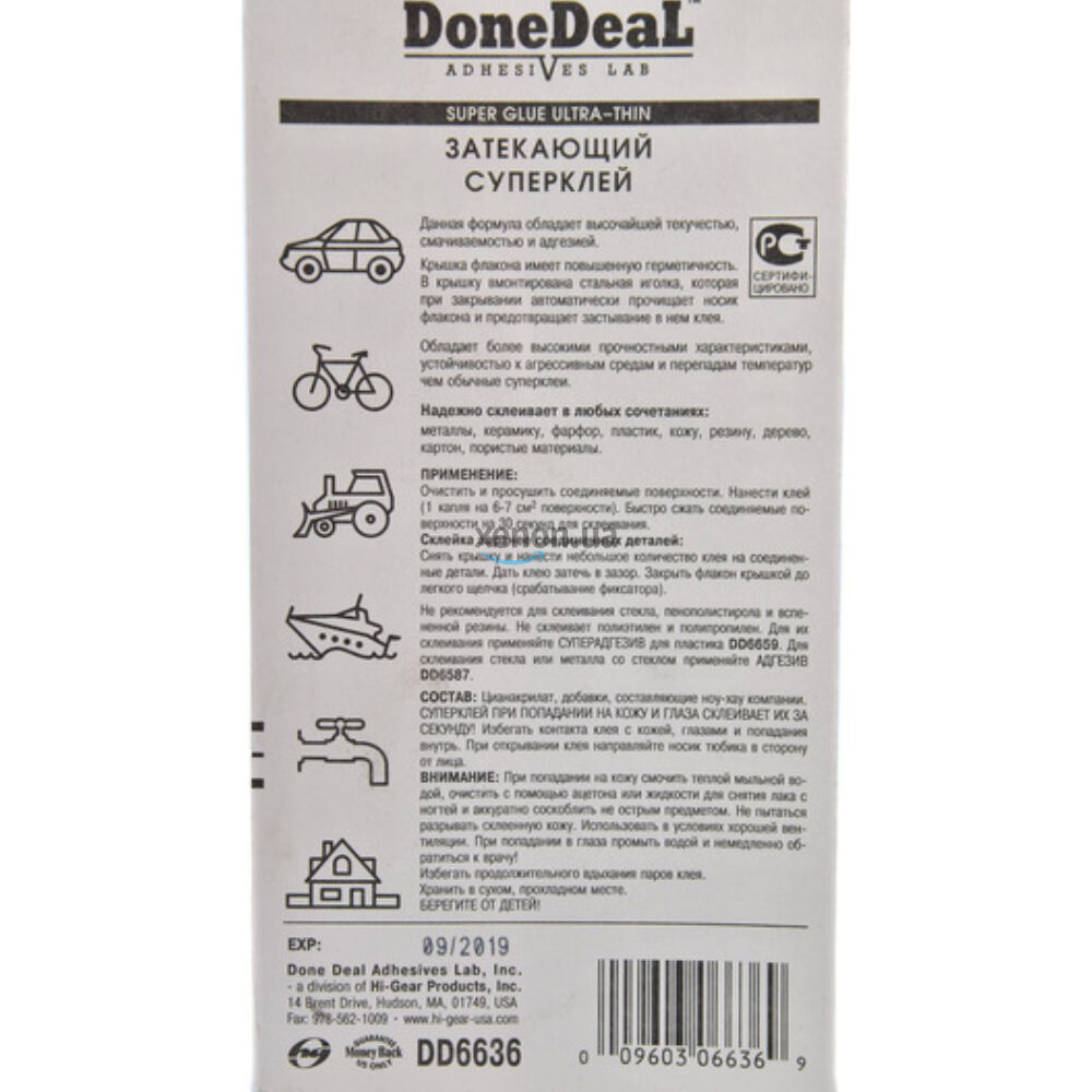 Предостережение. DD6636 - ПРИ ПОПАДАНИИ НА КОЖУ И ГЛАЗА СКЛЕИВАЕТ ИХ ЗА СЕКУНДУ! Избегать контакта клея с кожей, глазами и попадания внутрь. При открывании клея направляйте носик тюбика в сторону от лица. При попадании на кожу смочить теплой мыльной водой, очистить с помощью ацетона или жидкости для снятия лака и аккуратно соскоблить не острым предметом. Не пытаться разрывать склеенную кожу. Использовать в условиях хорошей вентиляции. При попадании в глаза промыть водой и немедленно обратиться к врачу! Избегать продолжительного вдыхания паров клея. БЕРЕГИТЕ ОТ ДЕТЕЙ!