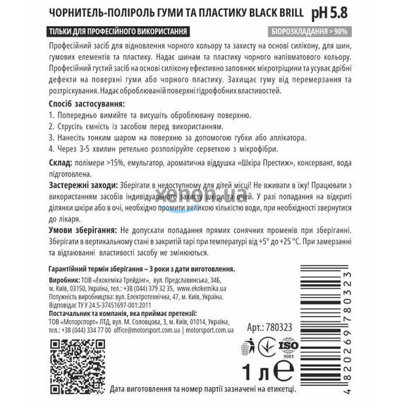 Ekokemika Pro-Line Black Brill – профессиональный чернитель-полироль для восстановления цвета и создания защитного слоя на резиновых и пластиковых деталях автомобиля. Формула средства обеспечивает глубокий черный цвет, интенсивный блеск и длительную защиту от выцветания и внешних воздействий.