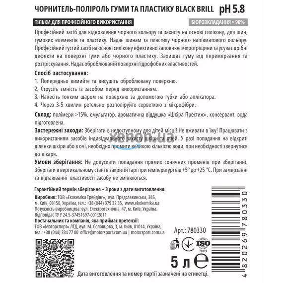 Ekokemika Pro-Line Black Brill – профессиональный чернитель-полироль для восстановления цвета и создания защитного слоя на резиновых и пластиковых деталях автомобиля. Формула средства обеспечивает глубокий черный цвет, интенсивный блеск и длительную защиту от выцветания и внешних воздействий.