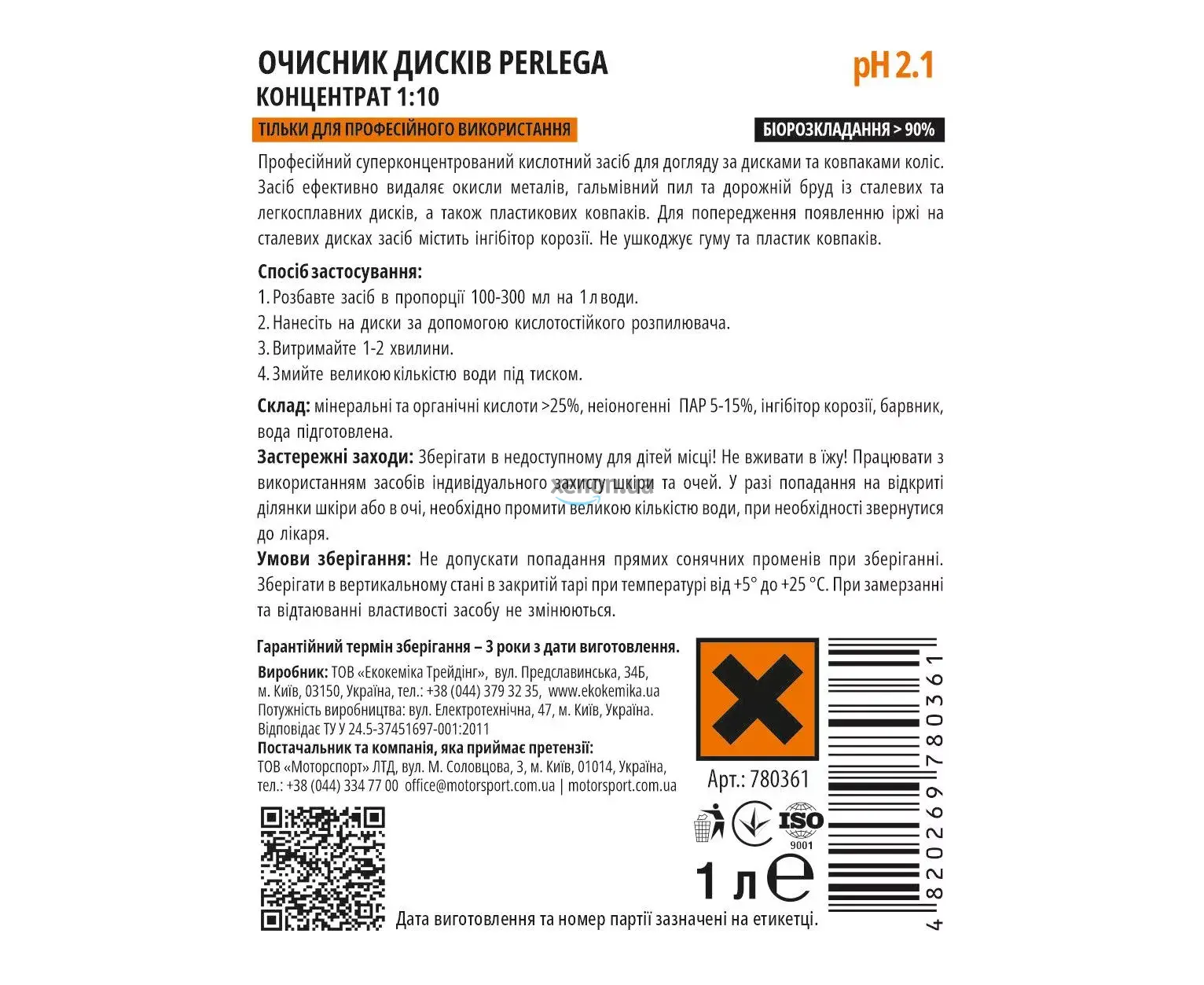 Профессиональное суперконцентрированное кислотное средство по уходу за дисками и колпаками колес. Средство эффективно удаляет окислы металлов, тормозную пыль и дорожную грязь из стальных и легкосплавных дисков, а также пластиковых колпаков. Для предупреждения появления ржавчины на стальных дисках средство содержит ингибитор коррозии. Не повреждает резину и пластик колпаков.
