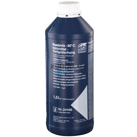 Готовый премиальный синий антифриз Febi G11 24196 объемом 1,5 литра. В двигателях внутреннего сгорания значительная часть энергии, получаемой при сгорании топлива, преобразуется в теплоту. Чтобы предотвратить перегрев двигателя и последующий выход его механических компонентов из строя, система охлаждения двигателя должна эффективно рассеивать теплоту в окружающую среду. Часть теплоты, отводимой системой охлаждения, в случае необходимости используется для нагрева воздуха в салоне автомобиля.