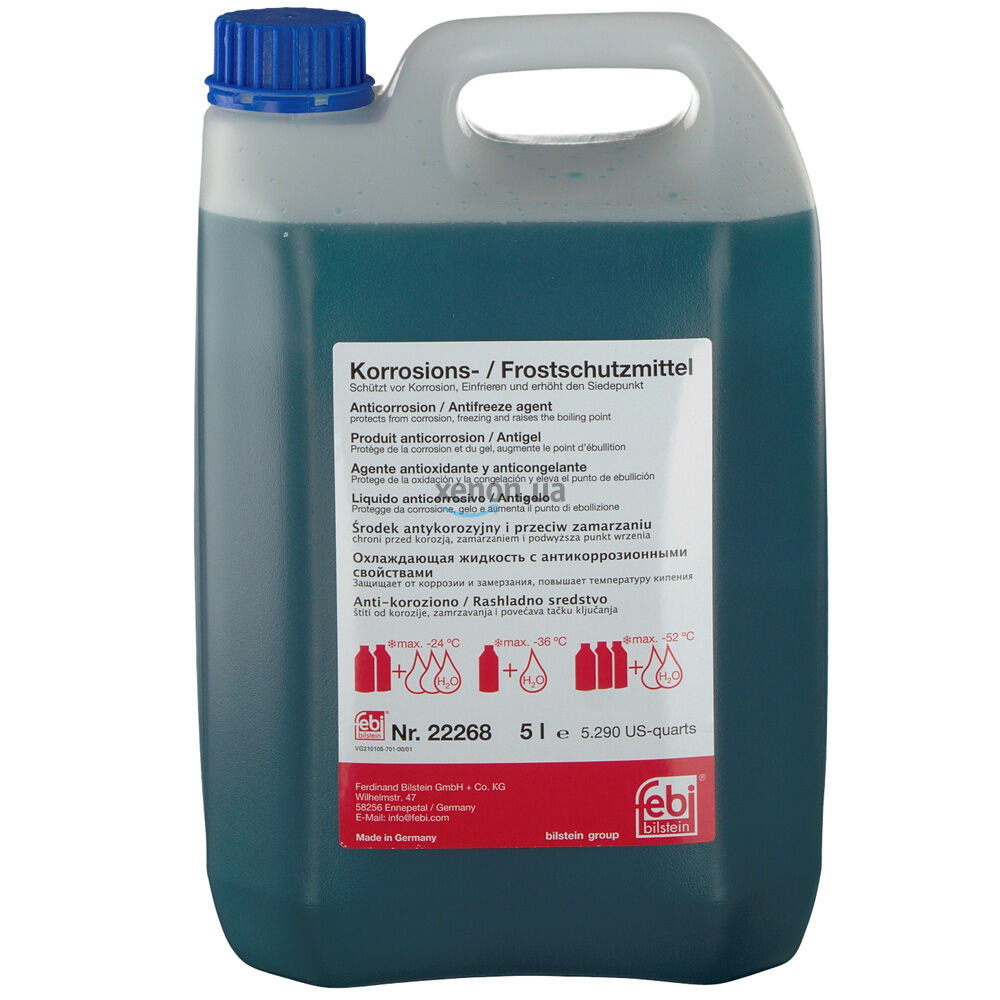 Синий концентрат премиального антифриза Febi G11 22268 объемом 5 литров. В двигателях внутреннего сгорания значительная часть энергии, получаемой при сгорании топлива, преобразуется в теплоту. Чтобы предотвратить перегрев двигателя и последующий выход его механических компонентов из строя, система охлаждения двигателя должна эффективно рассеивать теплоту в окружающую среду. Часть теплоты, отводимой системой охлаждения, в случае необходимости используется для нагрева воздуха в салоне автомобиля.