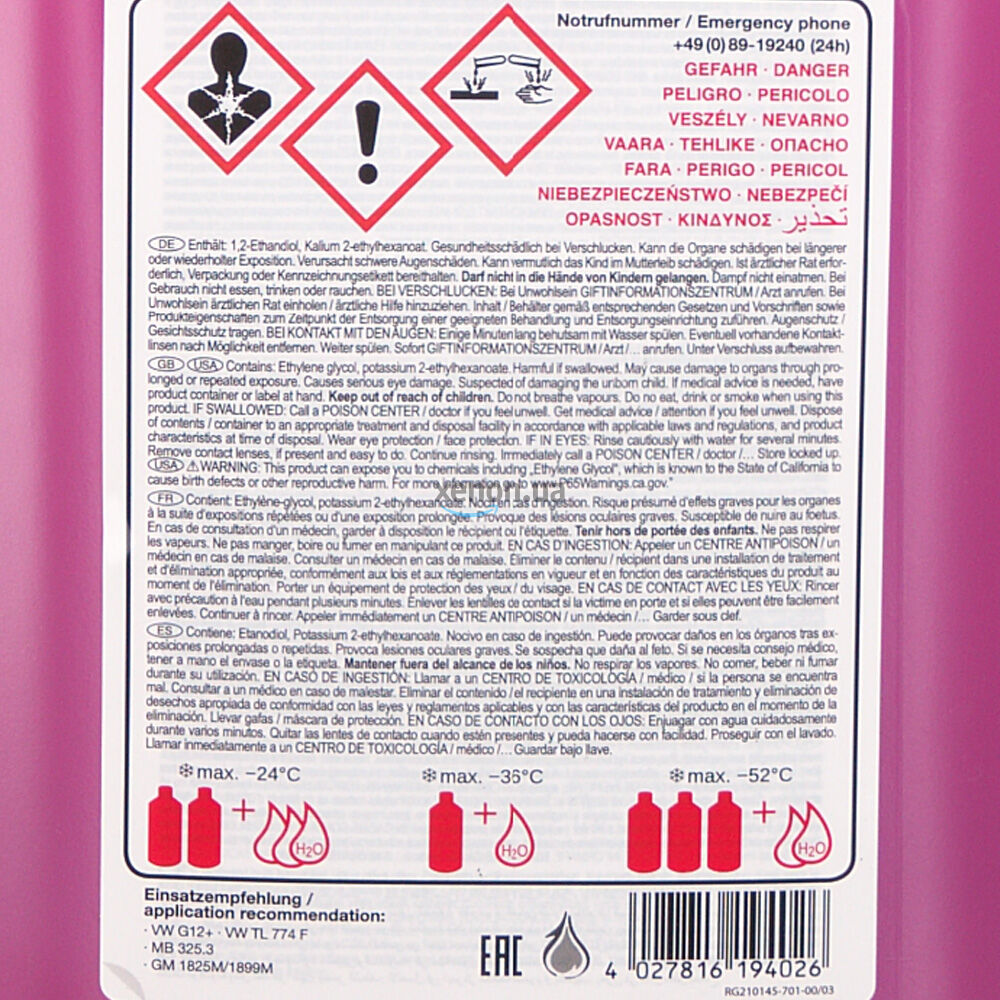 Допуски Febi G12+ G12 PLUS 19402: VW TL 774-F, VW TL 774-D, MB 325.3, Volvo VCS, MAN 324 SNF, DEXCOOL, Toyota SLLC, Ford WSS-M97B44-D