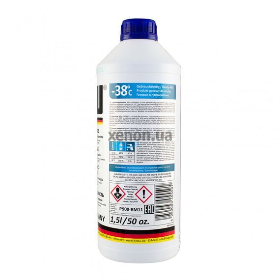 Синий антифриз HEPU G11 P900-RM11 (Германия) класса G11 с температурным режимом до -37°C и объемом 1,5 литра. Является готовым антифризом, аналог концентрата, смешанного 1:1 с дистиллированной водой, предназначен для использования сразу, смешивать с дистиллированной водой его не нужно. Готовая охлаждающая жидкость универсального применения. Защищает от замерзания, перегрева, коррозии и образования известкового налёта. Предназначена для алюминиевых и чугунных двигателей. Не содержит нитритов, аминов и фосфатов.