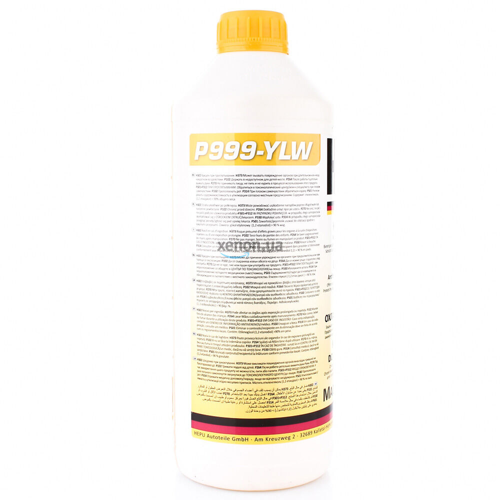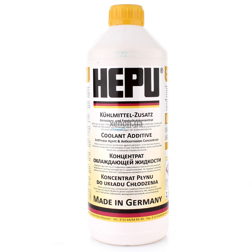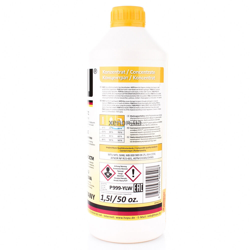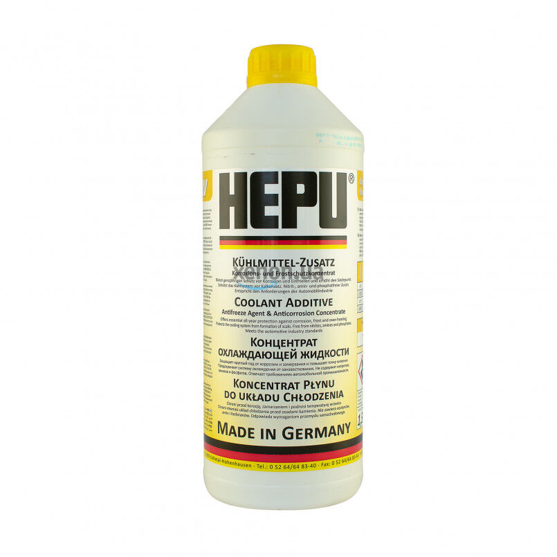 Желтый премиальный антифриз концентрат HEPU P999-YLW (Германия) класса G11 с температурным режимом -38°C объемом 1.5 литра. Является концентратом, предназначен для смешивания с дистиллированной водой. Концентрированная охлаждающая жидкость универсального применения. Защищает от замерзания, перегрева, коррозии и образования известкового налёта. Предназначена для алюминиевых и чугунных двигателей. Не содержит нитритов, аминов и фосфатов.