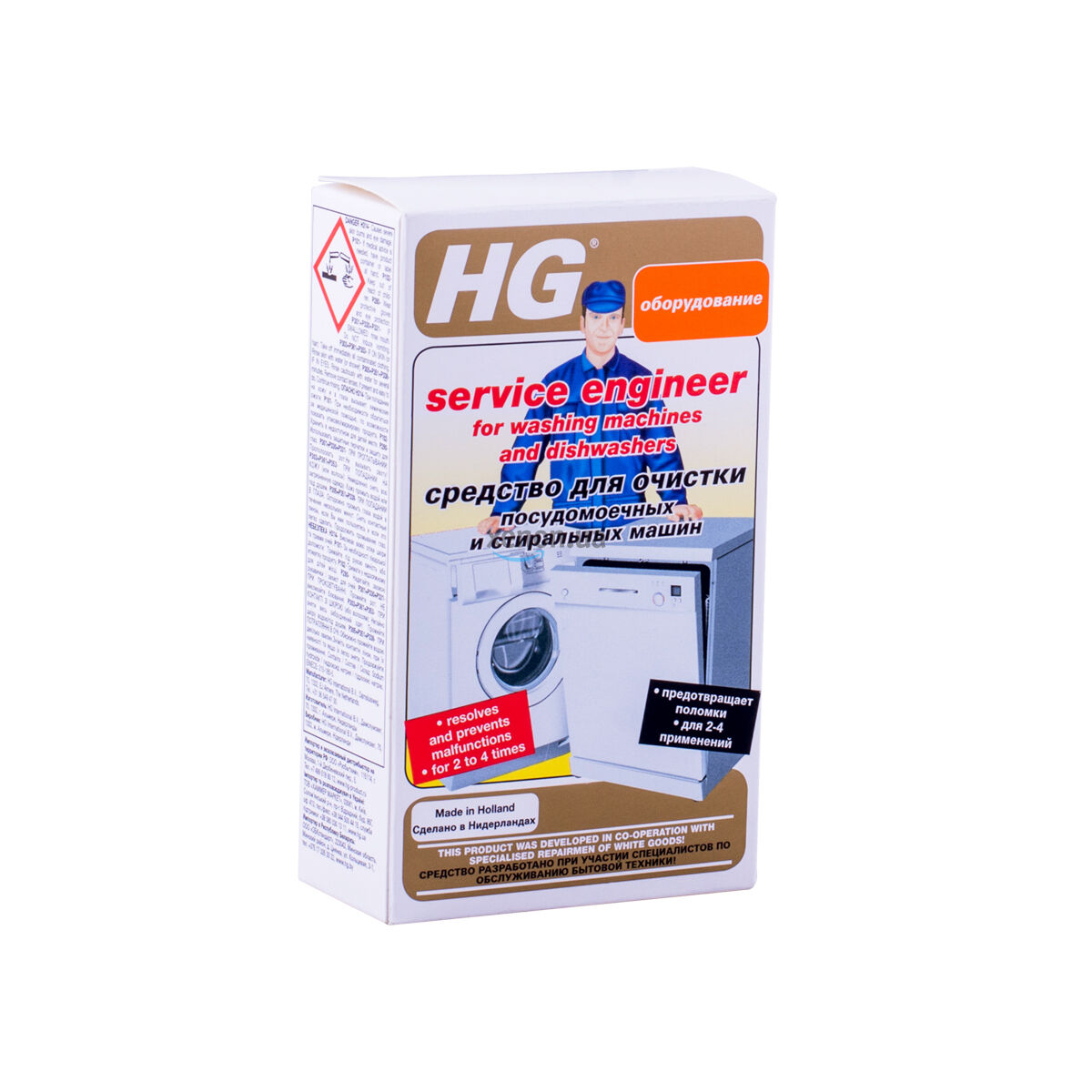 Для очистки посудомоечных и стиральных машин. Всех проблем, связанных с загрязнением частей механизма машины, можно избежать, если не реже раза в три месяца использовать специальные средства для ухода. Профессиональный подход гарантирует, что все части механизма Вашей стиральной или посудомоечной машины будут оставаться чистыми и работать безупречно. Средство не повреждает резиновые части механизма. Все внутренние детали машины сияют чистотой и работают безупречно. Ваша машина чисто не только снаружи, но и внутри! Убедитесь, что ваша посудомоечная машина не содержит посуды. Наполните контейнер для моющего средства в верхней линии (около 50 граммов) средством для чистки стиральных и посудомоечных машин HG. Запустите программу с высокой температурой нагрева воды (65°С), закройте дверцы и позвольте машине отработать полный цикл в соответствии с заданной программой. Стиральная машина Убедитесь, что Ваша стиральная машина не содержит белья. Влейте 100 мл средства в контейнер для стирального порошка. НЕ добавляйте никаких других средств. Включите машину и дайте ей отработать полный цикл стирки, включительно с процессом отжима.