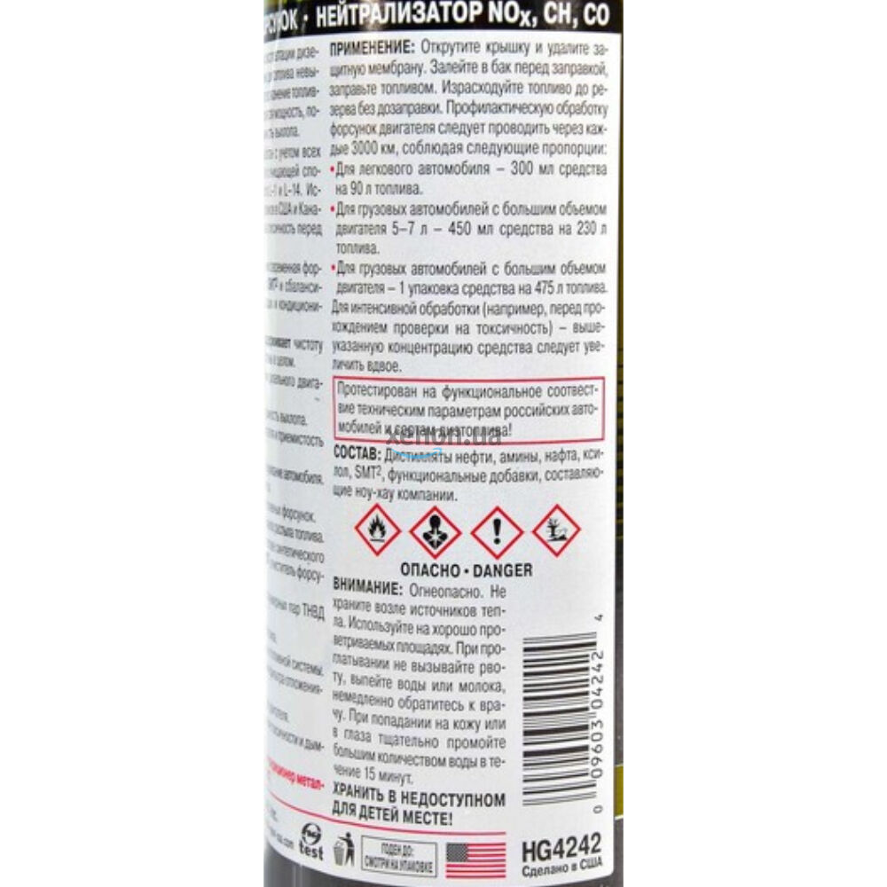 • При регулярном использовании современная формула HG4242, содержащая SMT2 и сбалансированный комплекс очищающих и кондиционирующих ингредиентов, востанавливает и поддерживает чистоту форсунок и топливной системы в целом