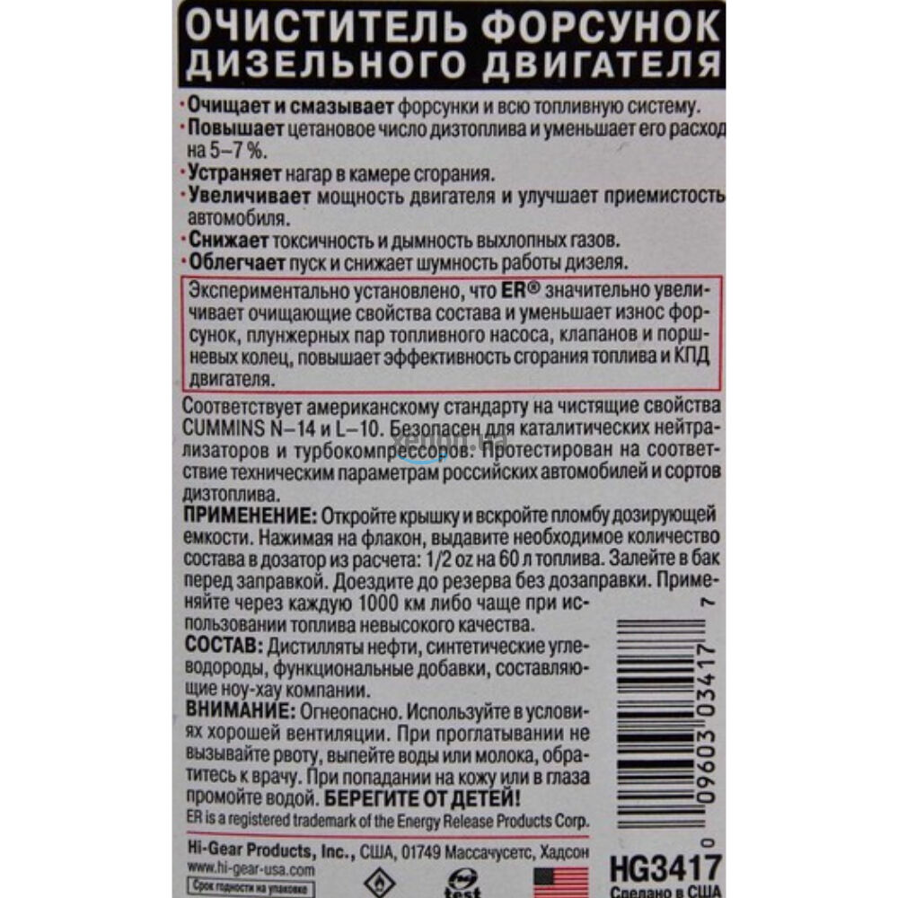 Эта дизельная топливная присадка, что следует из определения, предназначена для обработки дизельного топлива с целью сообщения ему ряда необходимых полезных свойств, в том числе очищающения форсунок и топливной системы. Кроме всего прочего, очиститель форсунок Hi-Gear HG3417 является цетан-корректором, благодаря чему возрастает теплотворность и полнота сгорания топлива, а следовательно, уменьшается дымность и токсичность выхлопа. В состав препарата входит синтетический кондиционер металла ER, который увеличивает эффективность действия многих составляющих этой присадки и способствует наилучшему и безопаснейшему растворению в топливе и сгоранию смытых загрязнений