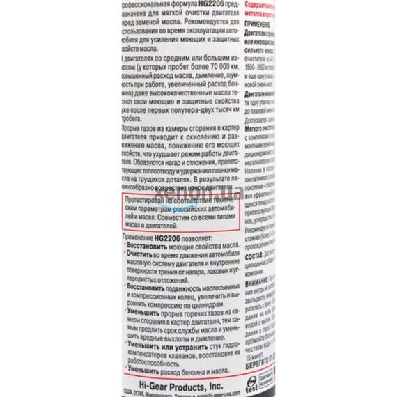 - Очиститель двигателя Hi-Gear HG2206 рекомендуется применять после длительной стоянки автомобиля (более 2-3 месяцев), а также перед прохождением техосмотра.