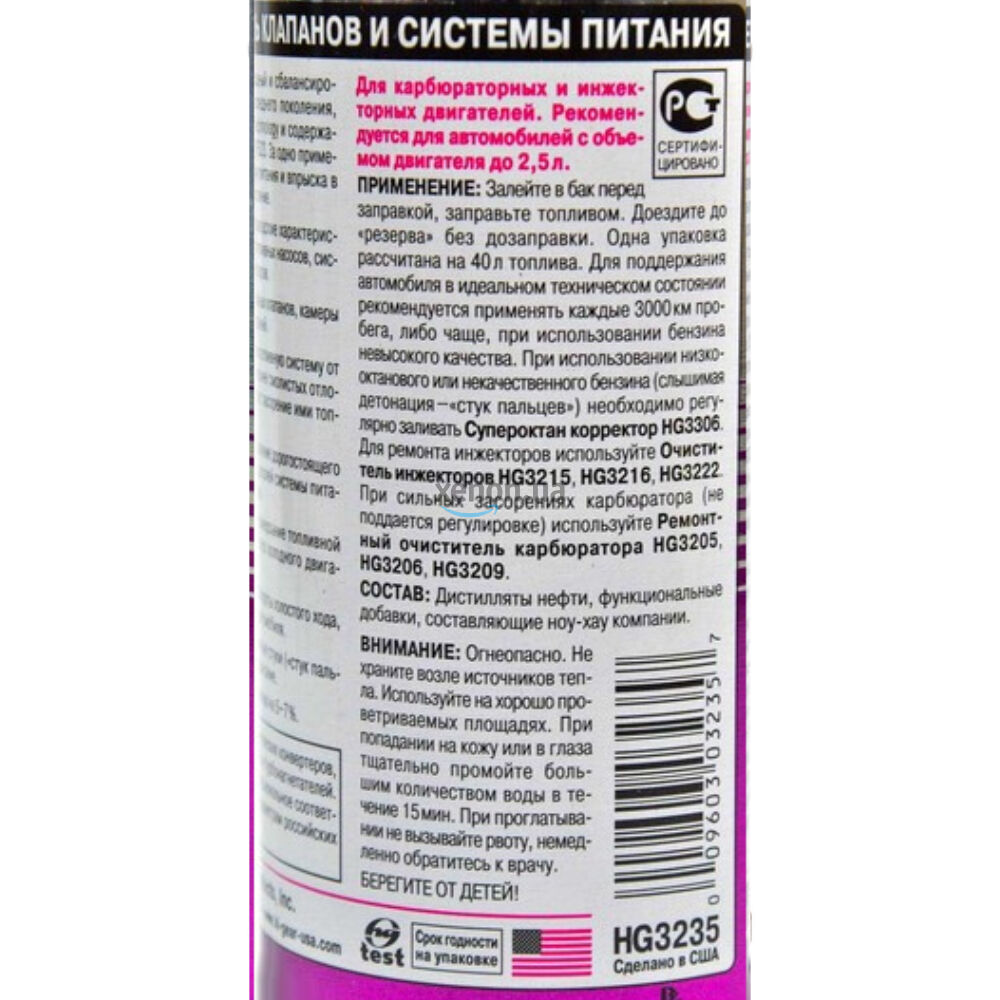 HG3235 - очень эффективное средство для поддержания в технической чистоте систем питания как карбюраторных, так и инжекторных бензиновых двигателей. Упаковка обработана пломбой для недоверчивых потребителей (открывается ключом как банка с пивом).