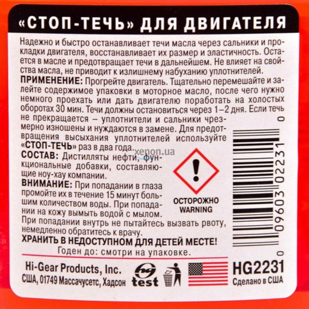- Восстановитель герметичности прокладок и сальников двигателя Hi-Gear HG2231 остается в масле и предотвращает течи в дальнейшем