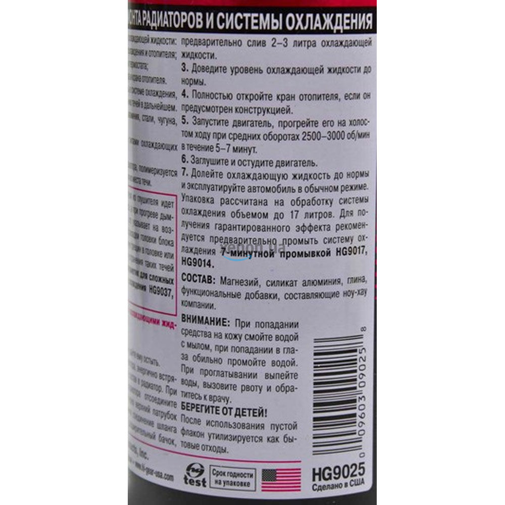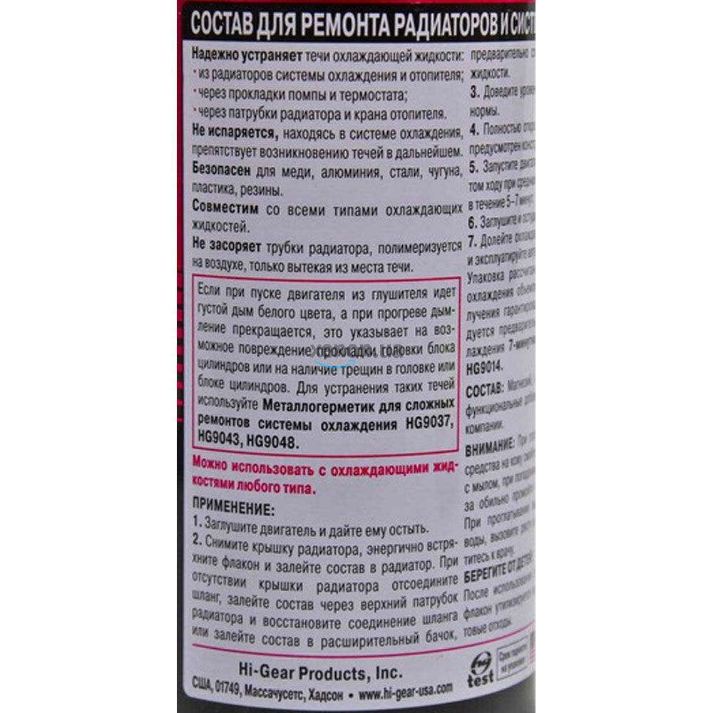 - Hi-Gear HG9025 не испаряется, выдерживает высокую температуру, остается в системе и препятствует возникновению течей в дальнейшем