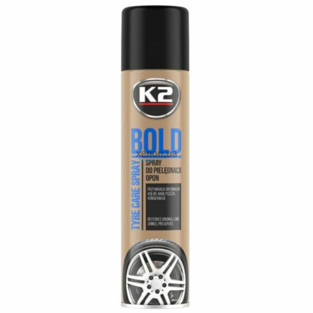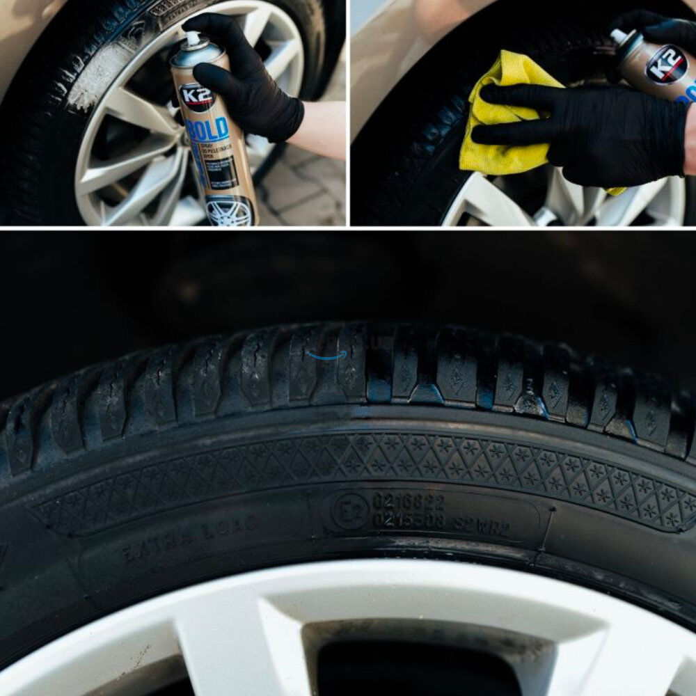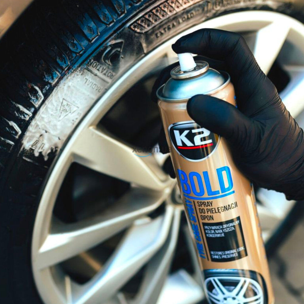 Средство для ухода за боковинами покрышек. Производится по особой технологии с добавлением специальных силиконовых полимеров и позволяет достичь насыщенного черного цвета покрышки и эффекта «мокрой резины». Обладает свойством проникать глубоко в микротрещины резины и вытеснять из них пыль, восстанавливая первоначальный цвет резины. Не оставляет пятен или разводов – остатки средства самостоятельно испаряются. После обработки наделяет боковины покрышек пыле- и влагоотталкивающими свойствами, которые поддерживают резину в чистоте на длительный период. Также, средство K2 BOLD SPRAY K1561 600мл надёжно защищает резину от воздействия внешних негативных факторов, в том числе прямых солнечных лучей и воды.