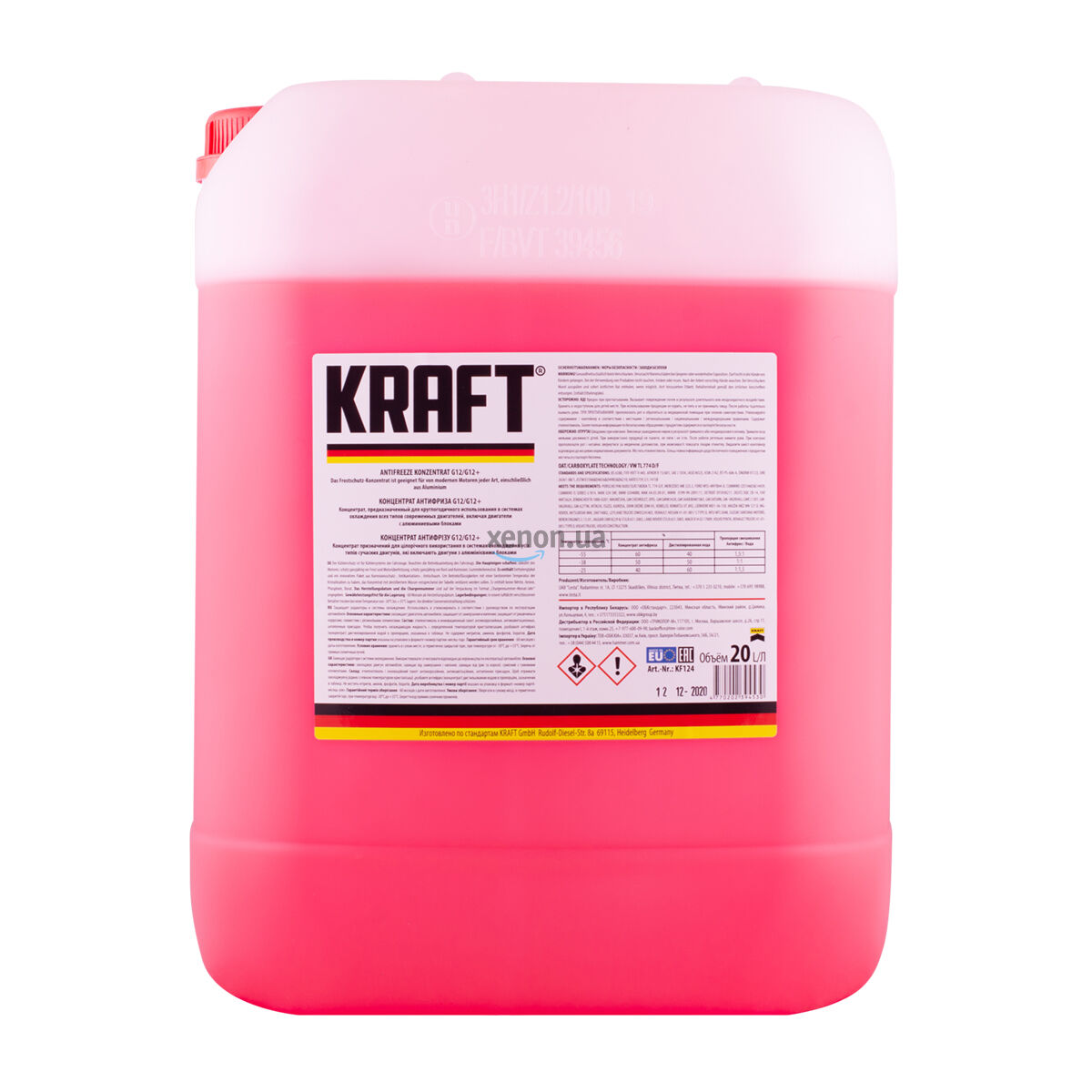 Премиальный антифриз с особенно низкой температурой замерзания и стойкостью к закипанию и испарению. Является универсальным продуктом, может применяться как в классических системах охлаждения и блоках цилиндров, выполненных из железа и чугуна, так и в современных – выполненных из алюминия, меди или сплавов. Благодаря этиленглеколевой основе и специально подобранным активным присадкам, антифриз KRAFT G12/G12+ красный концентрат KF124 20 л обеспечивает надёжную защиту от образования коррозии и ржавчины, обладает стойкостью к вспениванию.