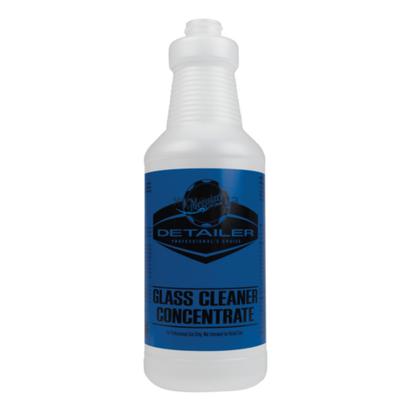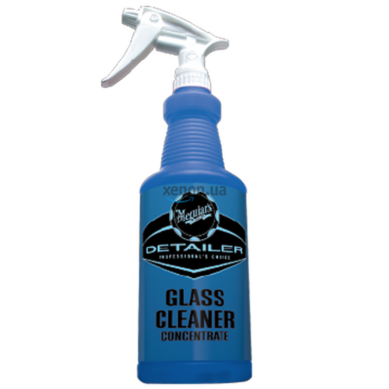 Пластиковая емкость с синей этикеткой для удобства идентификации и нанесения чистящего средства для стекол . На обратной стороне емкости есть шкала, по которой средство удобно разводить в бутылке.