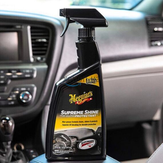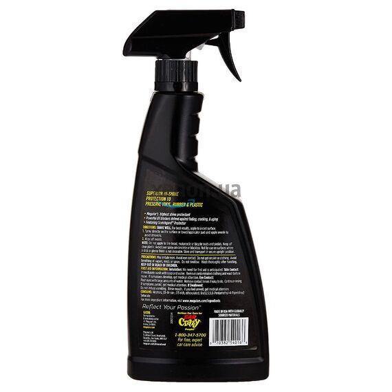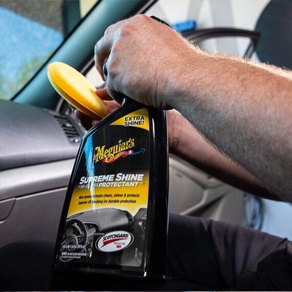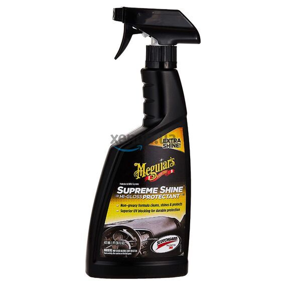Meguiars Supreme Shine Protectant. Со временем и под влиянием солнца и внешней среды винил и резина могут начать тускнеть. Meguiar's Supreme Shine Protectant – это идеальное решение для легкой очистки и защиты виниловых, резиновых и пластиковых поверхностей, оставляет глянцевый блеск, не жирный на ощупь.