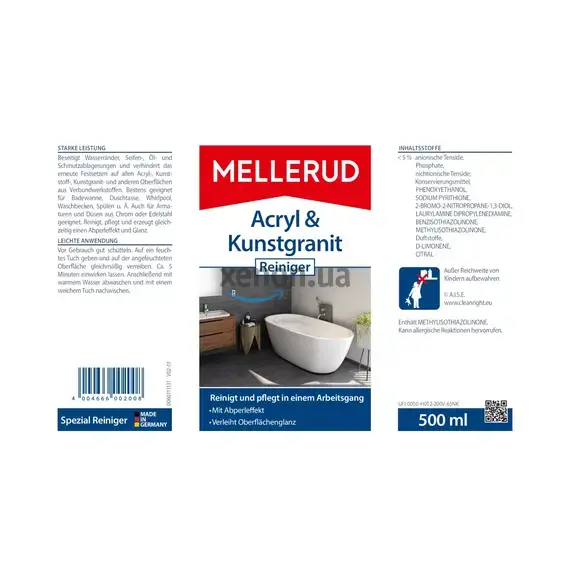 Средство для чистки акрила и искусственного камня 500 мл MELLERUD (2001002008) гарантированно удаляет известковые, мыльные, масляные отложения и другие виды загрязнений, предотвращая повторное появление пыли и грязи на всех поверхностях из акрила и других искусственных материалов и т.д. Очищает, ухаживает и придает одновременно водоотталкивающий эффект и блеск. Подходит также для чистки хромированных смесителей и фурнитуры из нержавеющей стали.