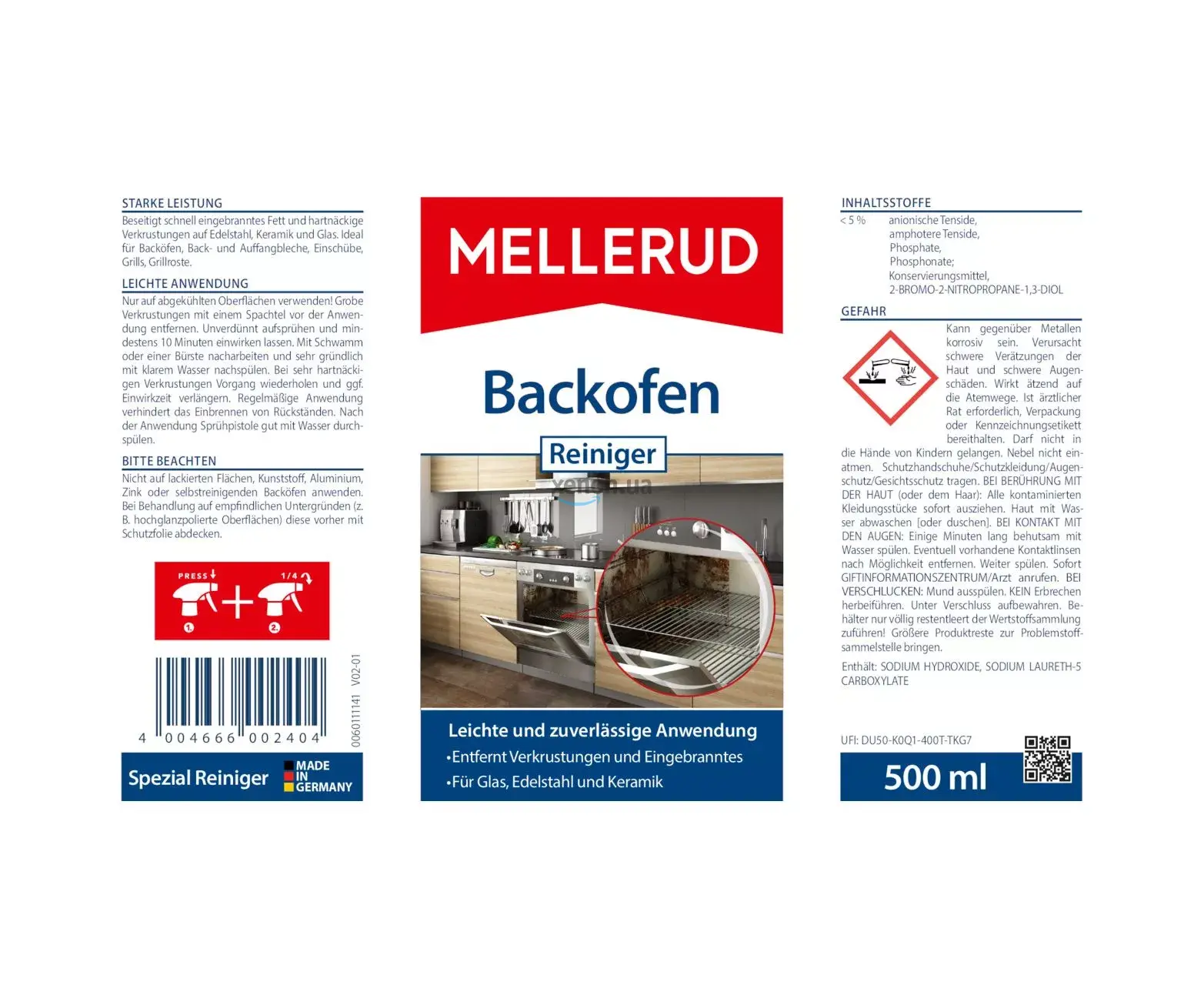 Средство для чистки духовых шкафов 500 мл MELLERUD (2001002404) быстро удаляет пригоревший жир и сильные загрязнения из гриля, печи-гриля, керамики и поверхностей из нержавеющей стали. Подходит также для духовок, газовых и электрических плит и кухонных плиток. Можно чистить противень и решетки барбекю.