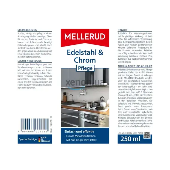 Средство для очистки и ухода за поверхностью из нержавеющей стали и хрома 250 мл MELLERUD (2001001780) эффективно защищает, чистит и одновременно ухаживает за поверхностью из высококачественной нержавеющей стали и хромированных поверхностей. Удаляет жировые отложения и загрязнения из вытяжек, плит, кухонных профилей и приборов, смесителей. Также подходит для перил и лифтов из высококачественной нержавеющей стали и хромированных. Специальная защитная пленка предохраняет поверхности от повторных загрязнений и отпечатков пальцев.