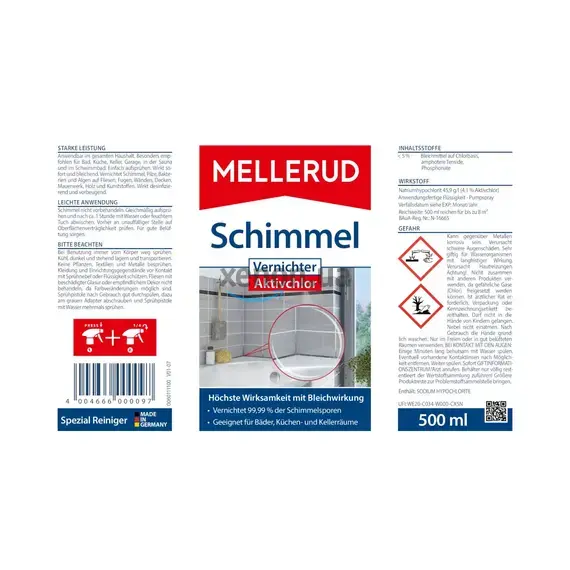 Средство удаления грибка и плесени с хлором 500 мл MELLERUD (2001000097) уничтожает все виды плесени в доме, сауне и бассейне. Просто распылите. Действует мгновенно. Уничтожает плесень, грибки, бактерии и водоросли. Подходит для облицовочной плитки, межплиточных швов, стен, потолка, каменной кладки, дерева, искусственных материалов. Дезинфицирует, предотвращает появление плесени.