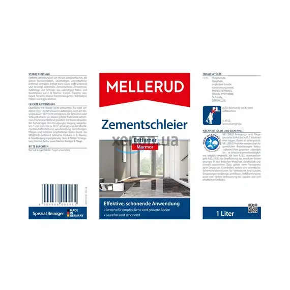 Средство для удаления извести и цемента из мрамора 1 л MELLERUD (2001000981) удаляет остатки цемента из плитки и поверхностей, которые не переносят кислоту, содержащуюся в продукте «Средство для удаления остатков цемента (Кислотный)». Это средство не содержит кислоты, действует бережно и без проблем удаляет цементный налет, остатки цемента, известковые отложения и грязь с природного и искусственного камня, содержащего известь (мрамор, каррарский мрамор, травертин, юрский мрамор, гранит, терраццо, агломерат).