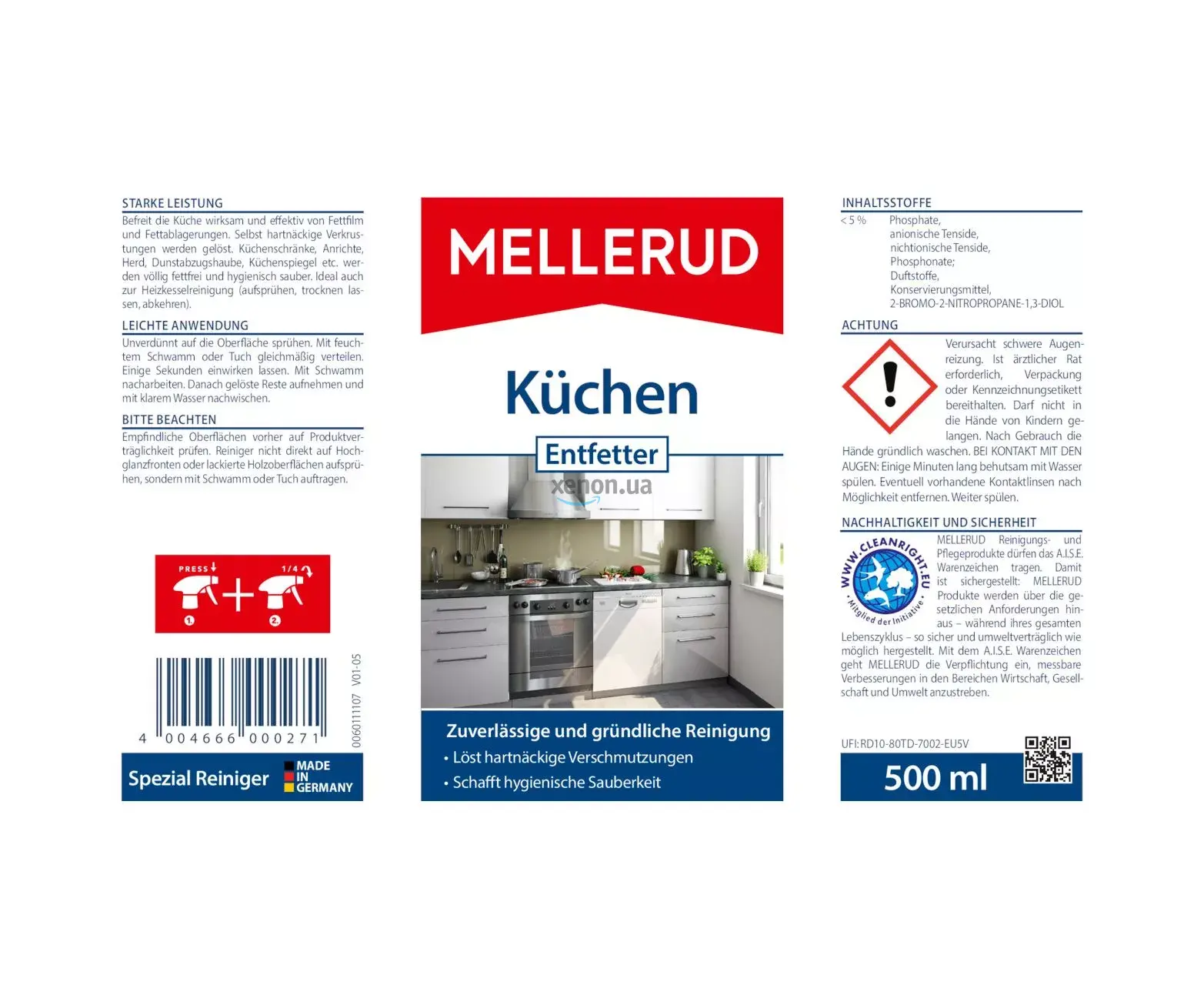 Средство для удаления жира 500 мл MELLERUD (2001000271) очень эффективно удаляет жир и пленку на кухне, растворяет даже устаревшие отложения. Подходит для чистки кухонных шкафов, столешниц, сервантов, плит, вытяжек. Полностью обезжиривает поверхность и обеспечивает гигиеническую чистоту.