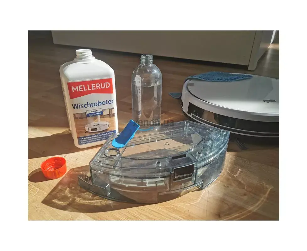 - Разбавьте средство для моющего робота-пылесоса в соответствии с объемом резервуара для воды в соотношении 1:20 с водой, например 25 мл концентрата на 500 мл воды.
