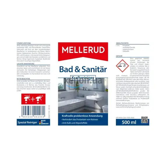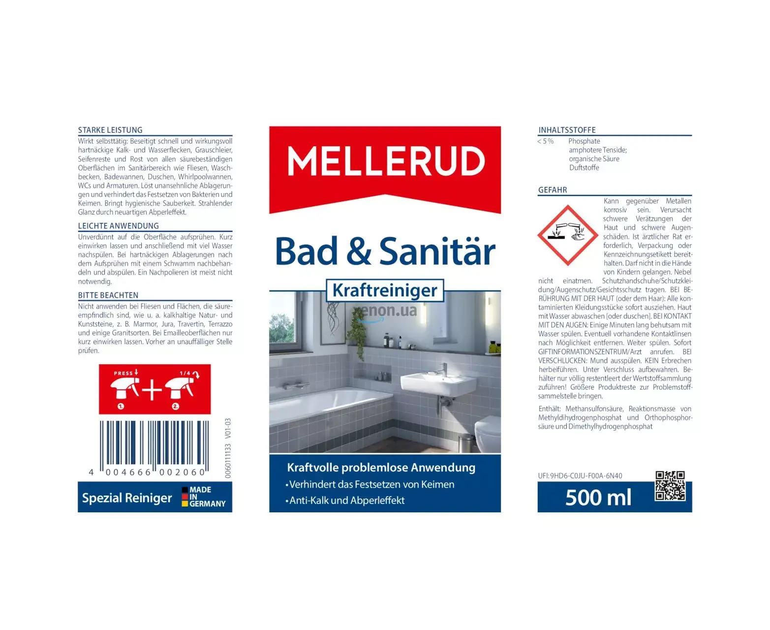 Средство для мытья ванной и сантехники 500 мл MELLERUD (2001002060). Растворяет малозаметные отложения и препятствует появлению бактерий и микробов. Создает гигиеническую чистоту и придает блеск благодаря водоотталкивающему эффекту.