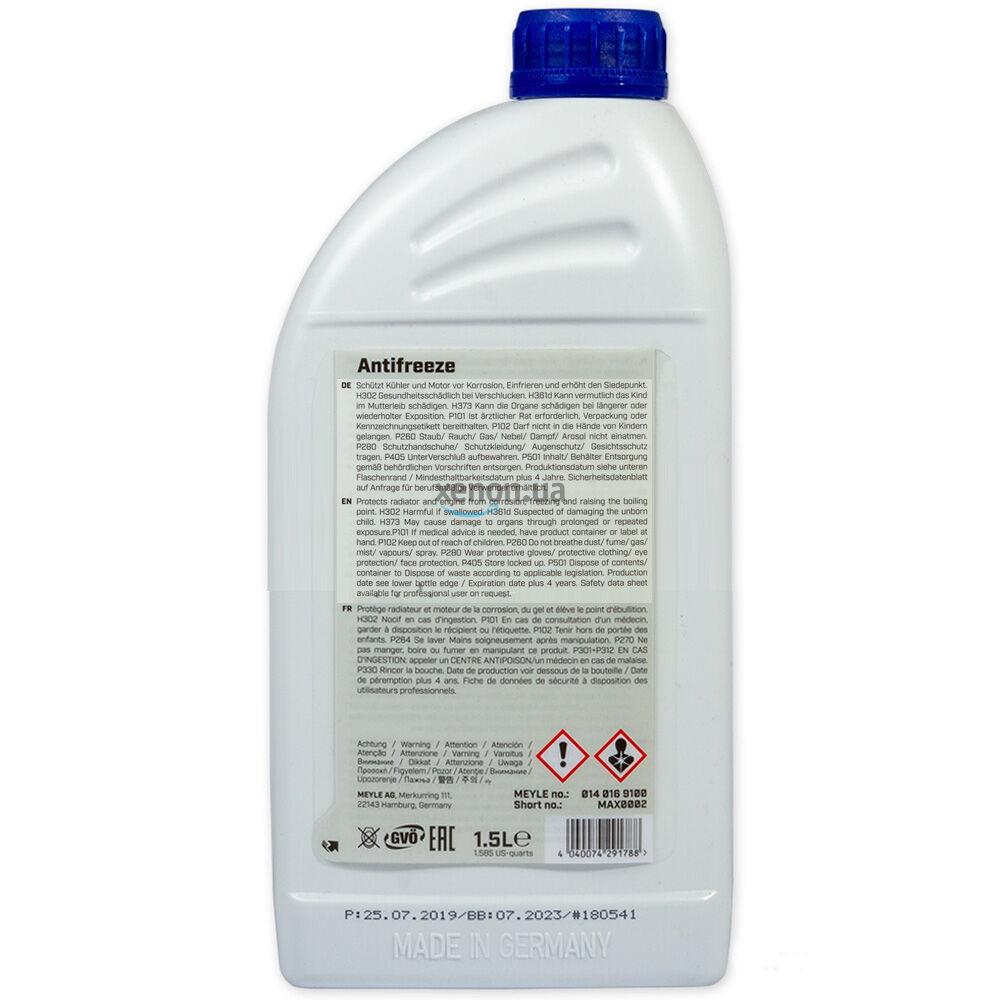 Синий готовый антифриз Meyle 014 016 9100 класса G11 объемом 1,5 литра.