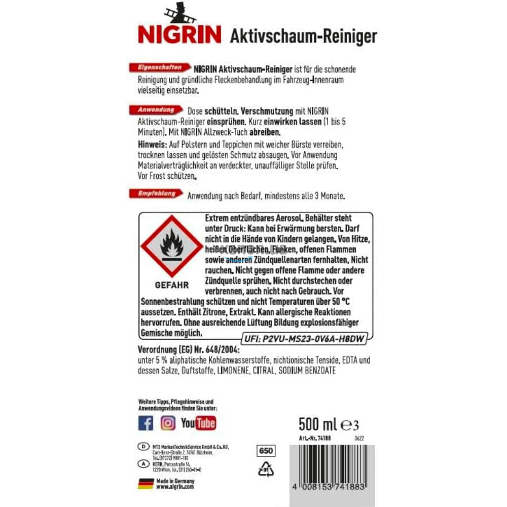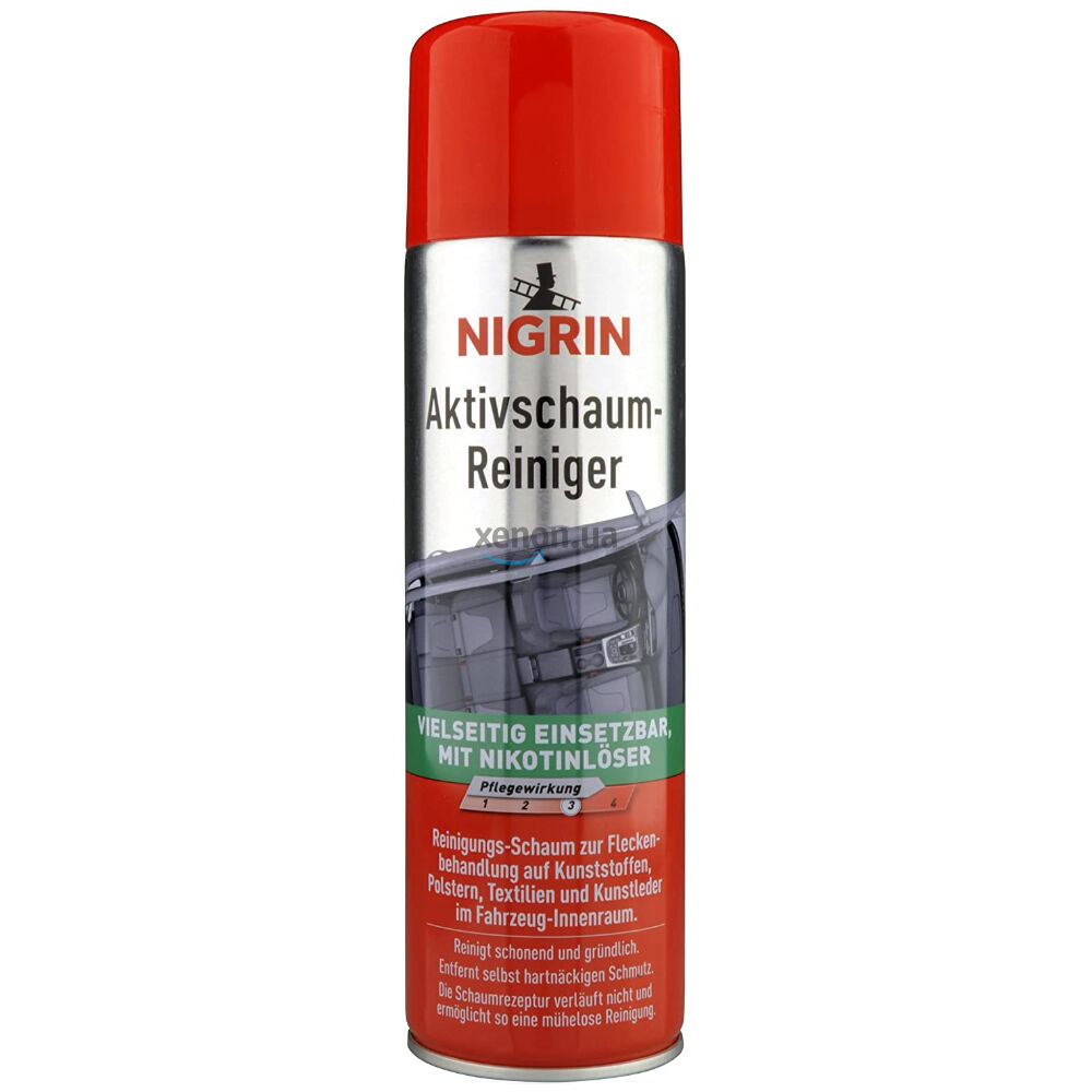 Немецкий универсальный пенный очиститель ткани, кожи, пластика NIGRIN Aktivschaum-Reiniger на 500 мл совместим со всеми типами поверхности. Это пена для сухой химчистки ткани, кожи, пластика, текстиля, ковров, ковролина, карпета, любых видов поверхностей. Обладает освежающим действием, устраняет неприятные запахи.