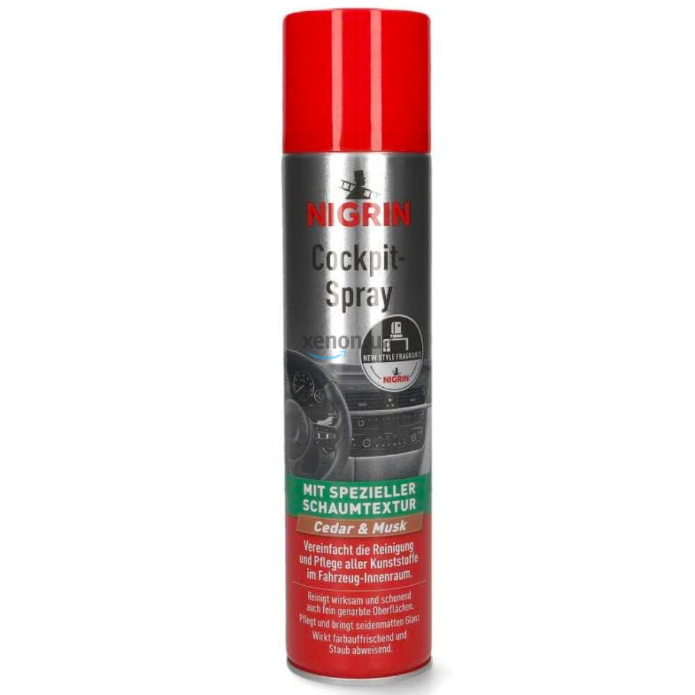 Немецкий пенный очиститель протектант для пластика с запахом кедра и муска NIGRIN Cockpit-Spray Cedar & Musk на 400 мл совместим со всеми типами пластика, винила, хрома. Он легко и безвредно очищает даже глубокие загрязнения, затем оставляет приятный запах и защитный слой от УФ-лучей и пыли.