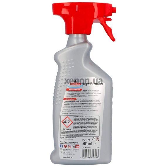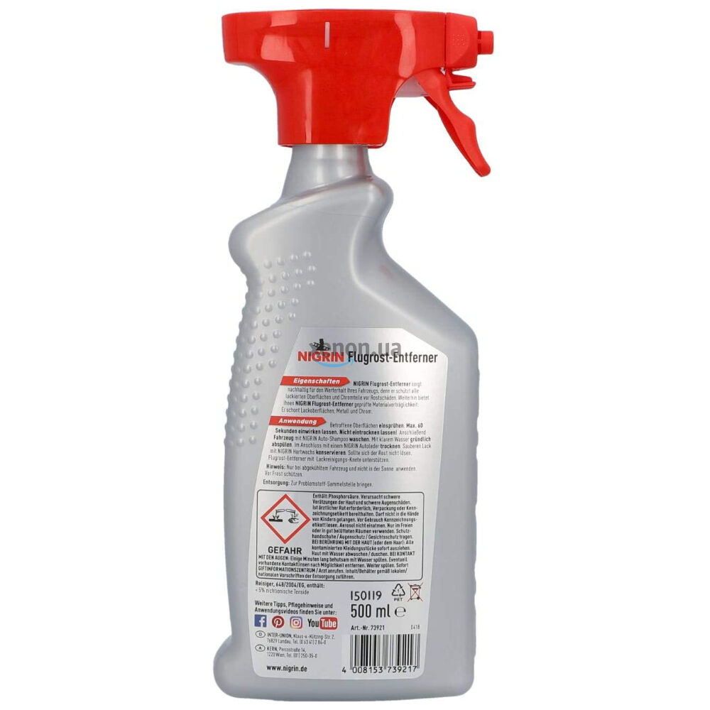 Немецкий преобразователь ржавчины NIGRIN Flugrost- Entferner в упаковке 500 мл с триггером для распыления. Один из самых популярных продуктов в Германии, который используется для предотвращения ржавчины на начальных этапах. Удаляет пленку ржавчины (коррозии), окислы, ржавые точки (которые чаще всего могут появляться на капоте), а также подходит для удаления глубоких загрязнений на окрашенных поверхностях кузова, включая пластиковые. Способен удалить птичий помет, остатки насекомых, дорожный битум, который глубоко въелся в лакокрасочное покрытие кузова автомобиля и его деталей.
