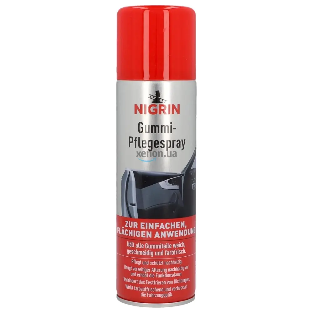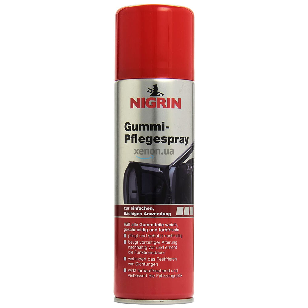 Немецкий спрей для ухода за резиновыми деталями NIGRIN Gummi-Pflegespray на 300 мл. Спрей для ухода за резиной NIGRIN защищает все резиновые детали от преждевременного старения, например, из-за высыхания, потрескивания и выцветания. Спрей для ухода за резиной NIGRIN также подходит для ухода за охлаждающими шлангами, патрубками и уплотнениями в моторном отсеке.