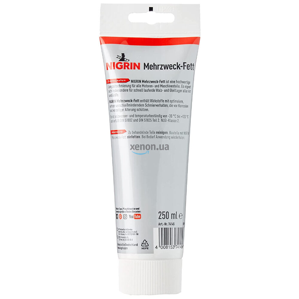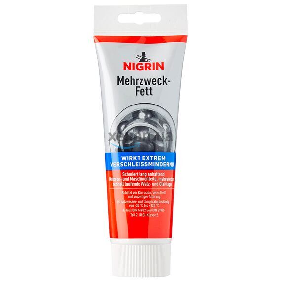 Немецкая универсальная смазка NIGRIN Mehrzweck-Fett на 250 мл. Универсальная смазка NIGRIN - это высококачественная долговременная смазка для всех деталей двигателя и машин. Она особенно подходит для высокоскоростных роликовых подшипников и подшипников скольжения всех типов и размеров.