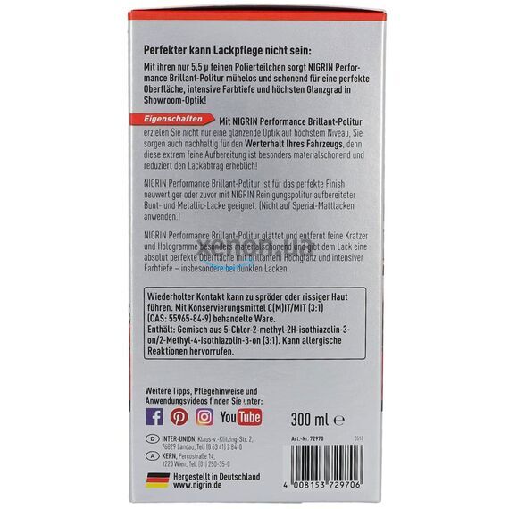 В наборе PERFORMANCE более концентрированная полироль, мягче и лучше очищает, содержит небольшое количество воска, чем в классической полироли NIGRIN Reinigungs-Politur. PERFORMANCE в наборе дает немного блеска и небольшой гидрофобный эффект.