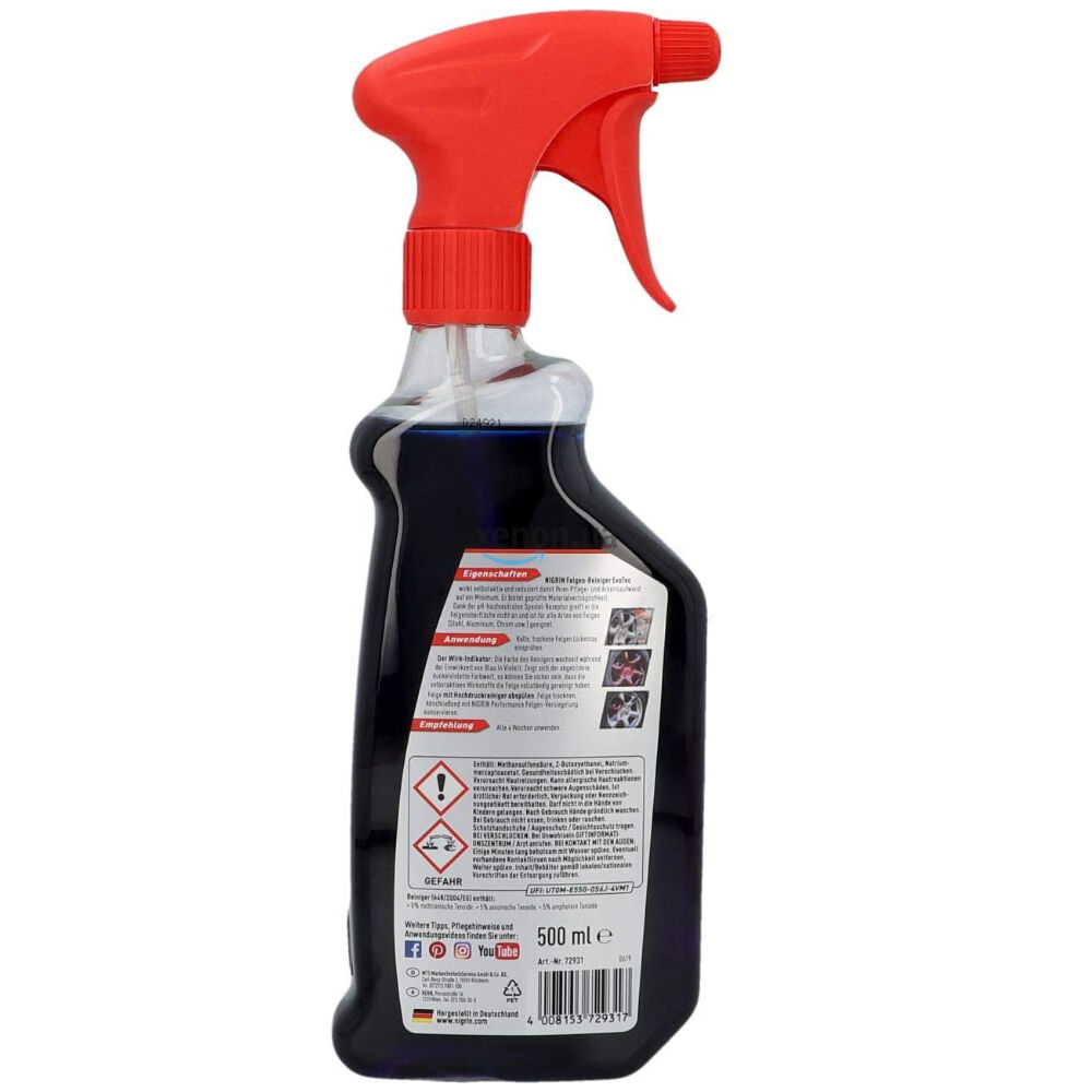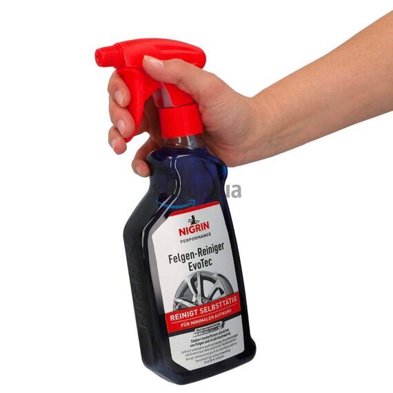 Немецкий бескислотный активный очиститель колесных дисков с индикатором NIGRIN Performance Felgen-Reiniger EvoTec подходит для всех типов колесных дисков для безвредной и быстрой очистки от глубоких загрязнений. Благодаря нейтральной pH-формуле совместим со всеми красками (включая порошковые), и со всеми типами колесных дисков (стальные, алюминиевые, хромированные и др).