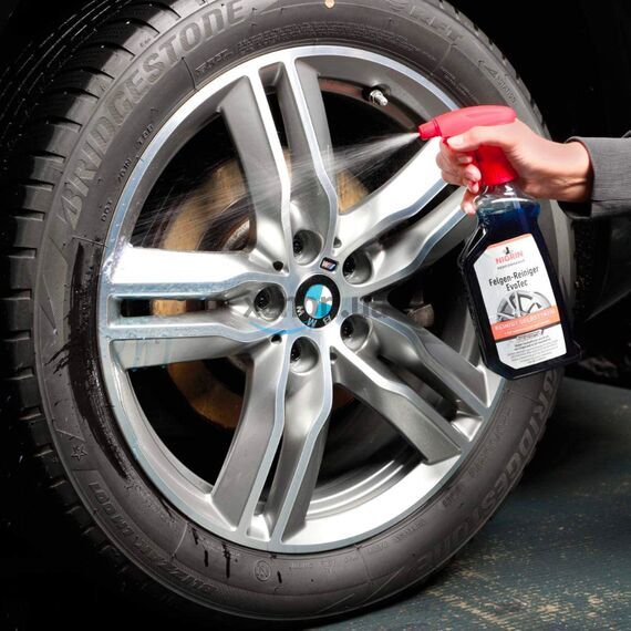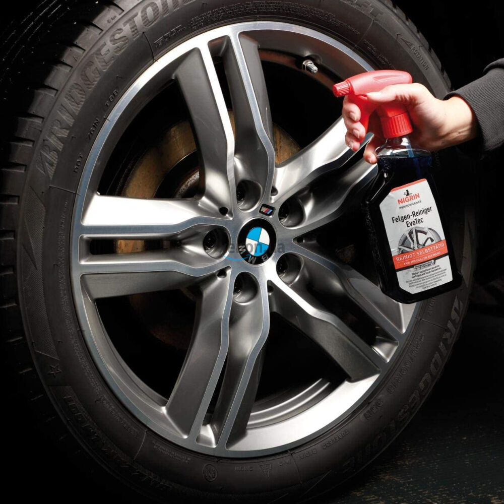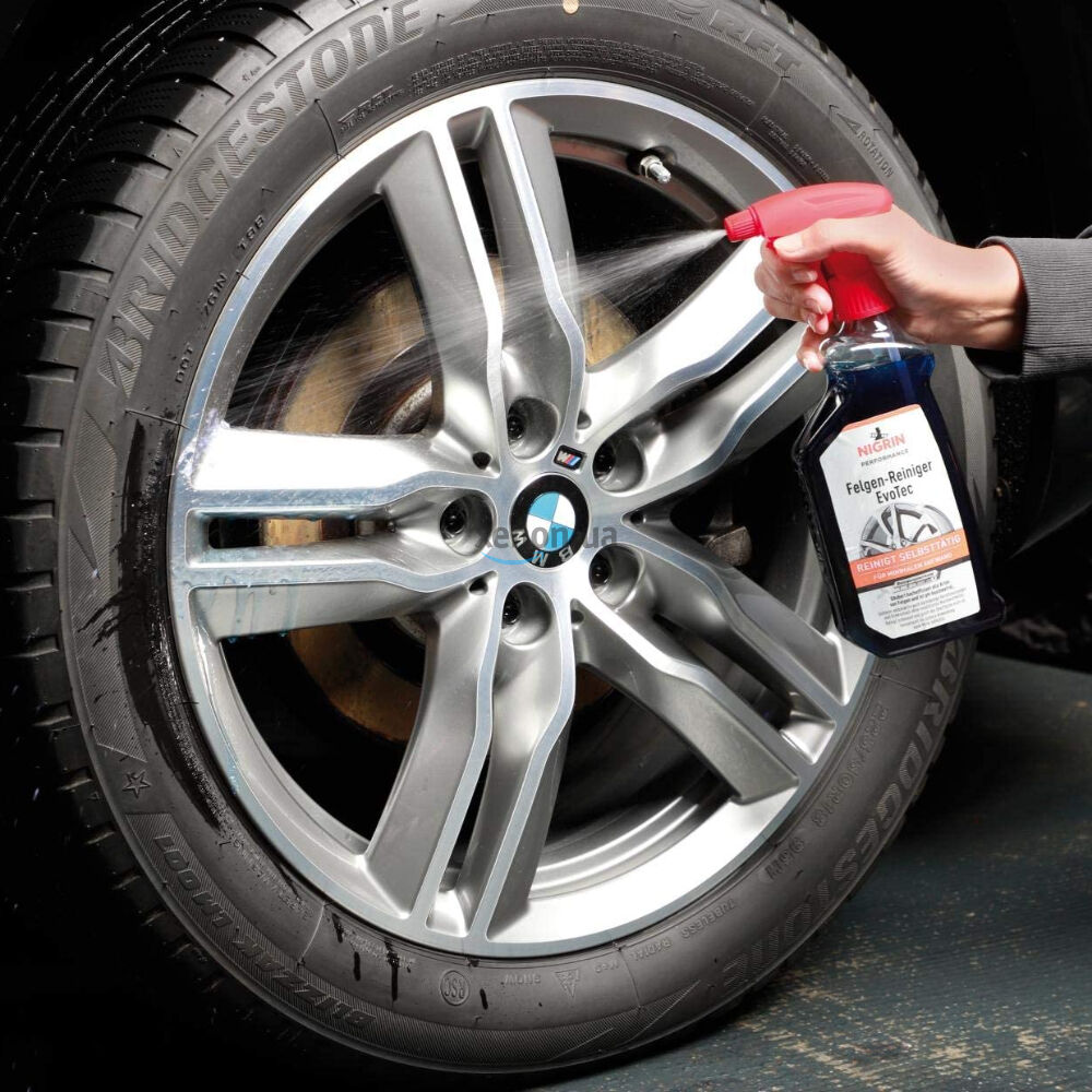 - Распылите очиститель NIGRIN EvoTec на холодный и сухой колесной диск; распыляйте обильно, чтобы покрыть все колесо;