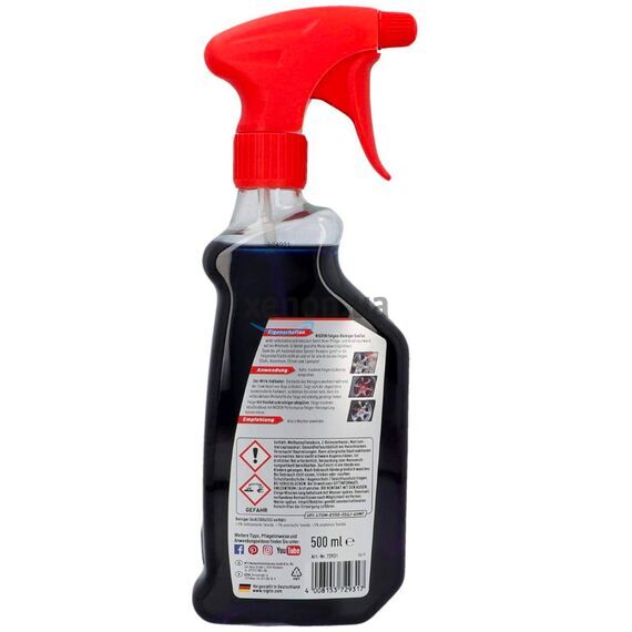 Безвреден и не требует от Вас усилий для очистки колес: активная формула очистителя сама все сделает. Во время обработки жидкость превратится в темно-фиолетовый цвет (индикатор очистки), после чего Вы можете смыть всю разъевшуюся грязь водой. Очищает тормозную пыль, битум, жир, все виды загрязнений.