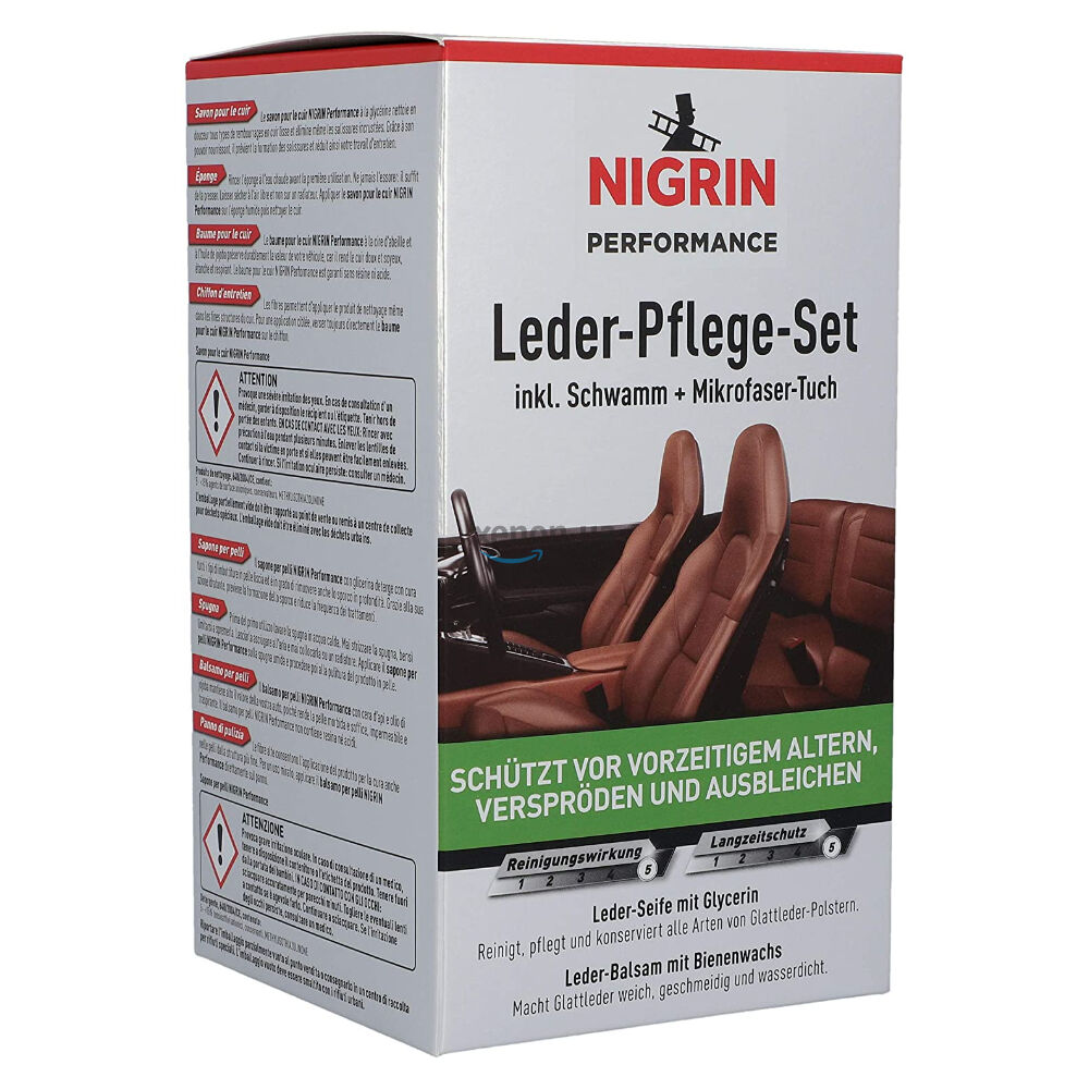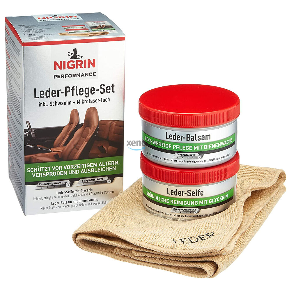 Немецкий набор для комплексного ухода за кожей автомобиля NIGRIN Performance Leder-Pflege-Set Seife +Balsam содержит нежный очиститель кожи 250 мл, бальзам для защиты кожи 250 мл, губку для очистки кожи и специальную салфетку для кожи. Вам больше ничего не нужно, чтобы качественно и аккуратно очистить и защитить кожаные сиденья, кресла, панели.