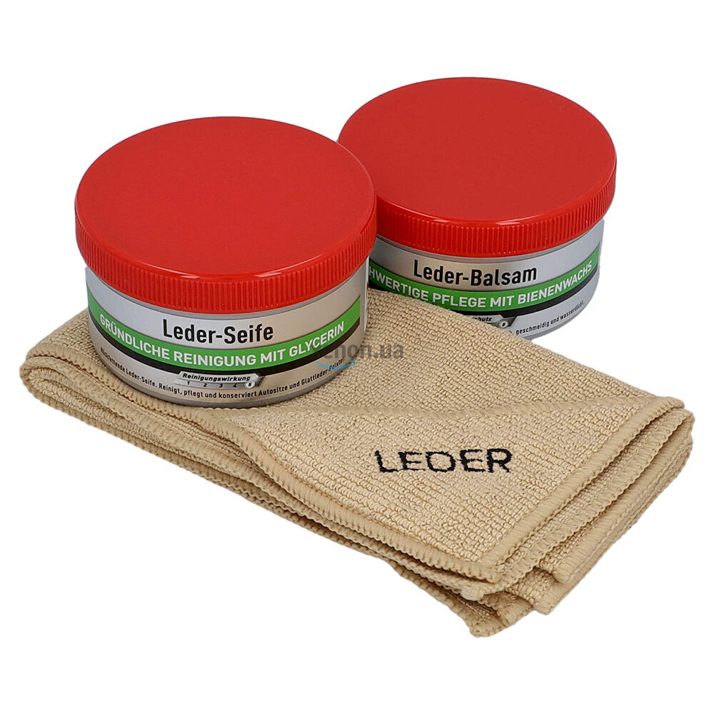 В комплект входит: очиститель кожи 250 мл, губка для очистки кожи, бальзам для кожи 250 мл, салфетка для кожи автомобиля.