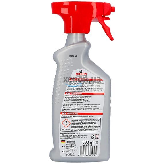Немецкий очиститель мягкой крыши кабриолета NIGRIN Performance Verdeck Reiniger на 500 мл. Очиститель складного верха NIGRIN Performance - это мягкий и щадящий специальный очиститель для всех текстильных складных верхов. При регулярном использовании сохраняется первоначальная свежесть цвета, что улучшает внешний вид вашего автомобиля. Защищает мягкий верх от преждевременного старения из-за обесцвечивания и погодных условий. После использования и очистки рекомендуется защитить крышу с помощью пропитки для кабриолетов NIGRIN.